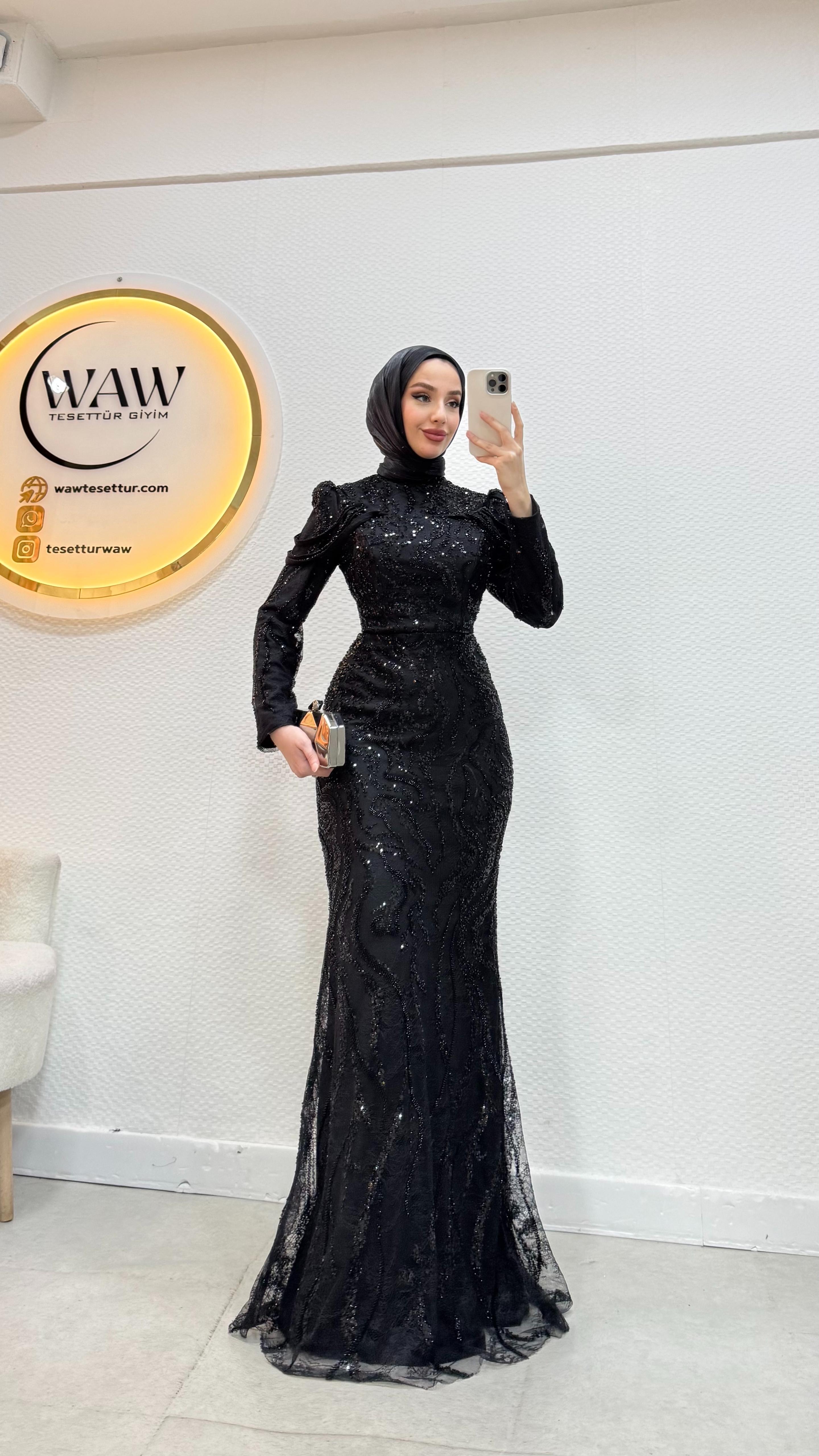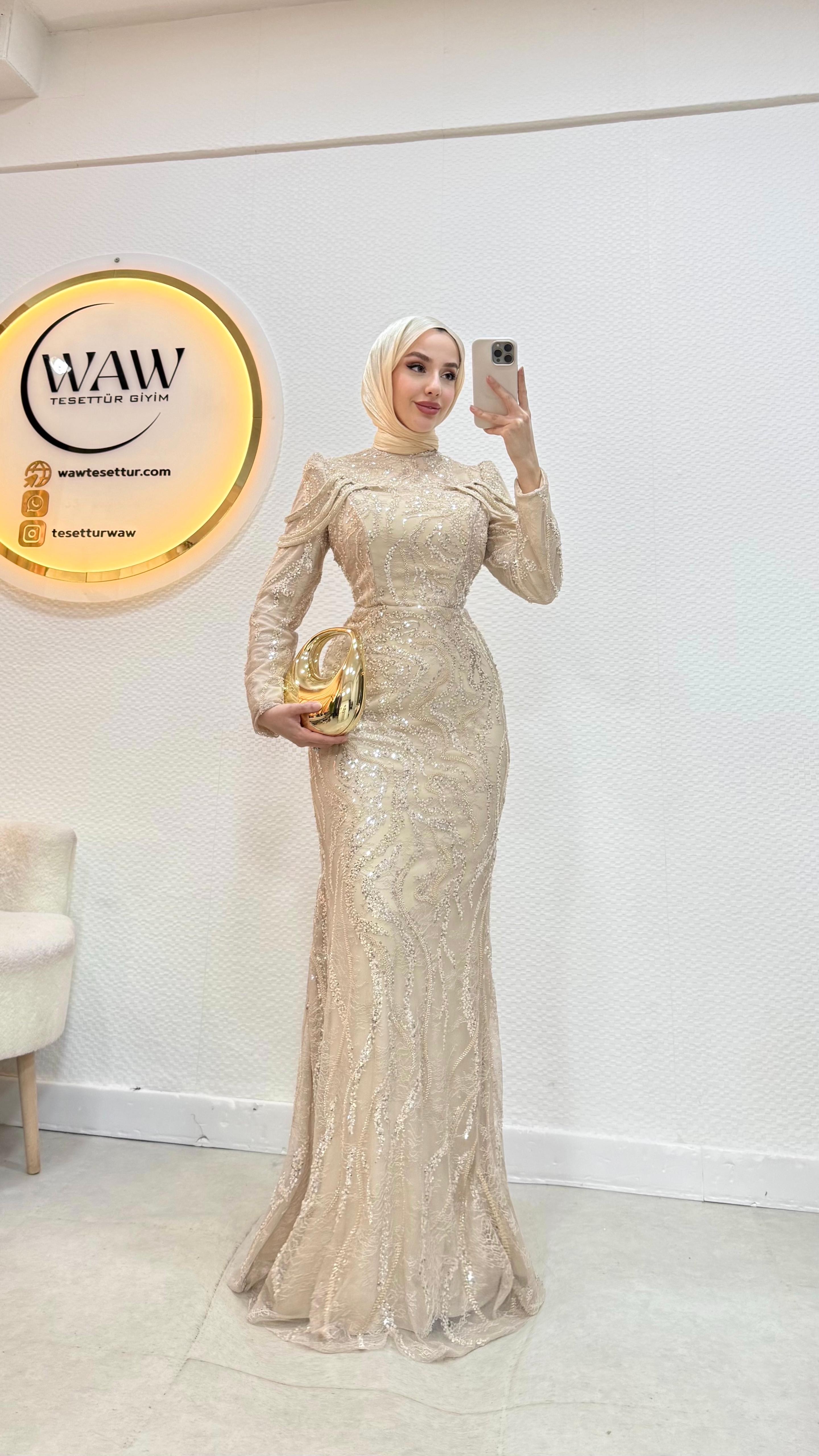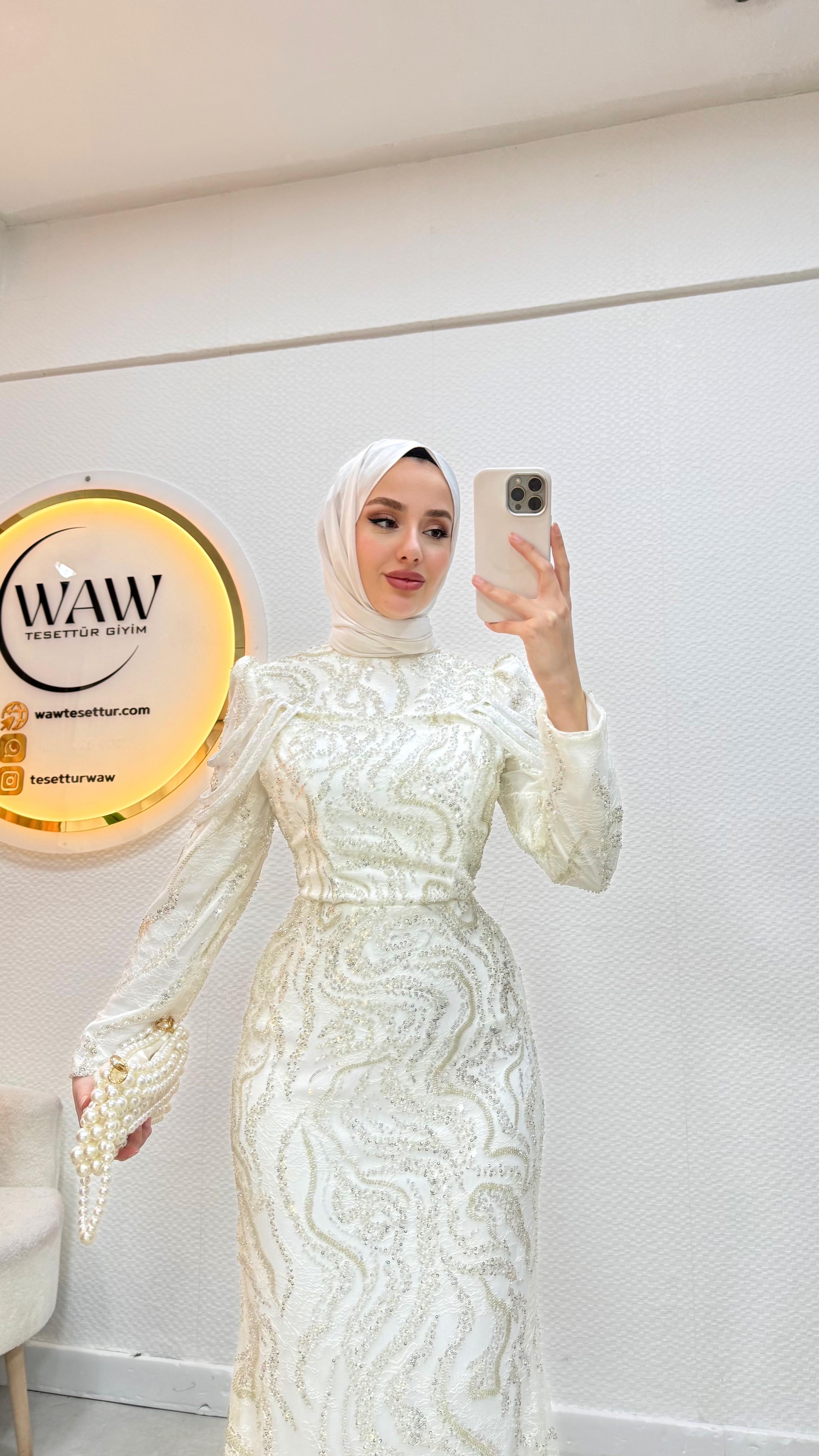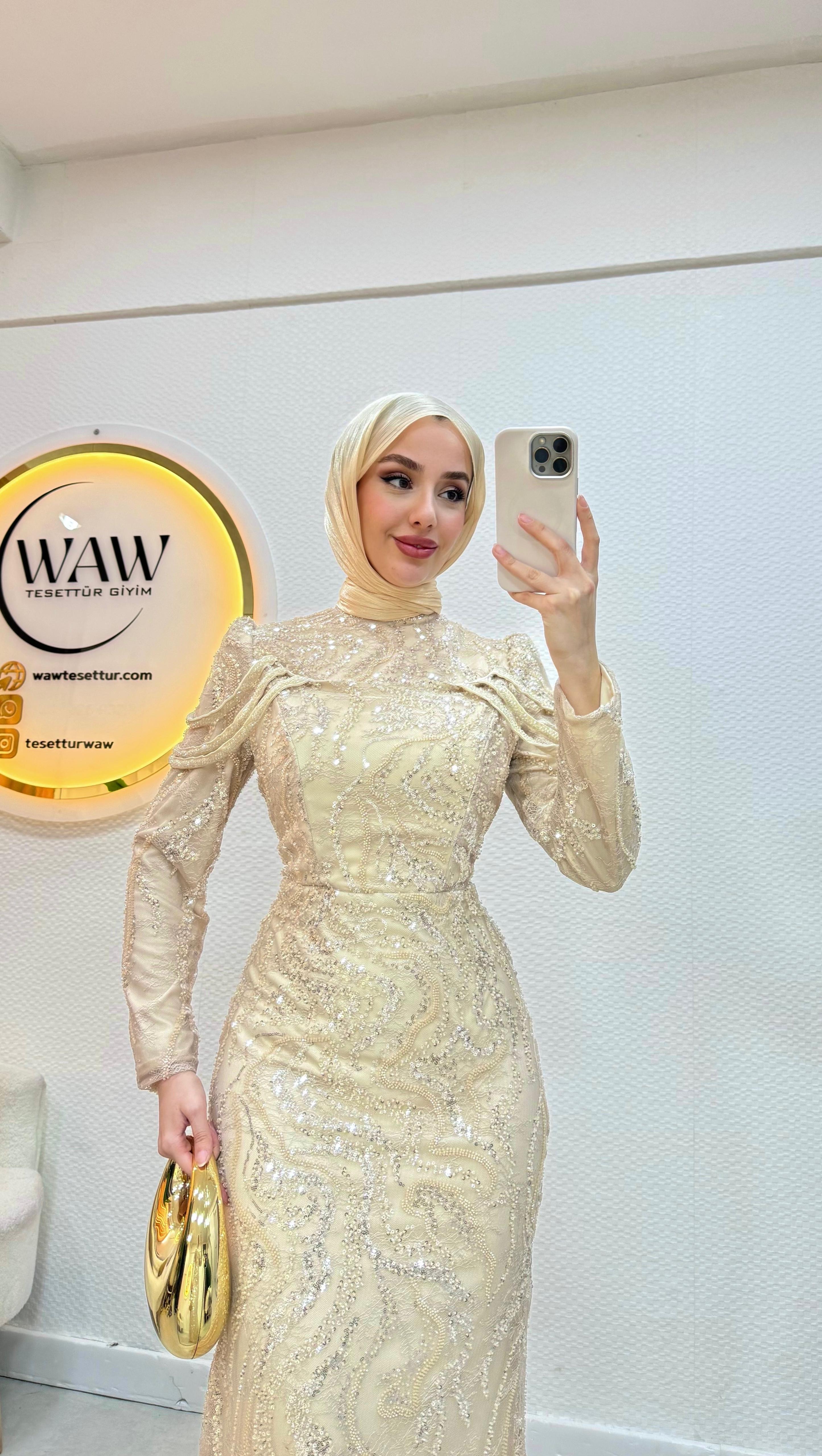 Taş işlemeli kumaştan üretilmiştir Tam kalıp Orta arka gizli fermuarlı Boy: 145 Bedenler 36/38/40/42/44/46 Manken 170/60kg 38 beden tercih etmektedir