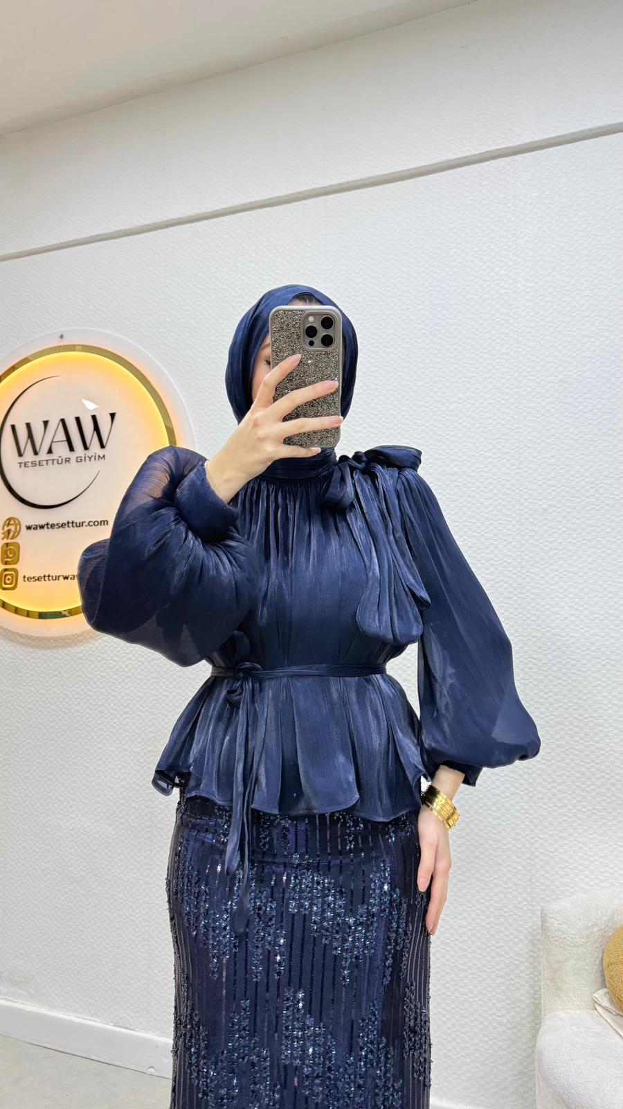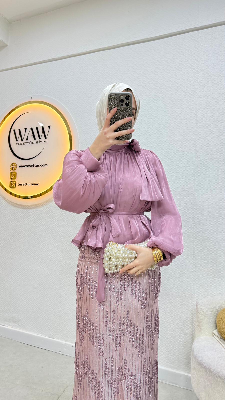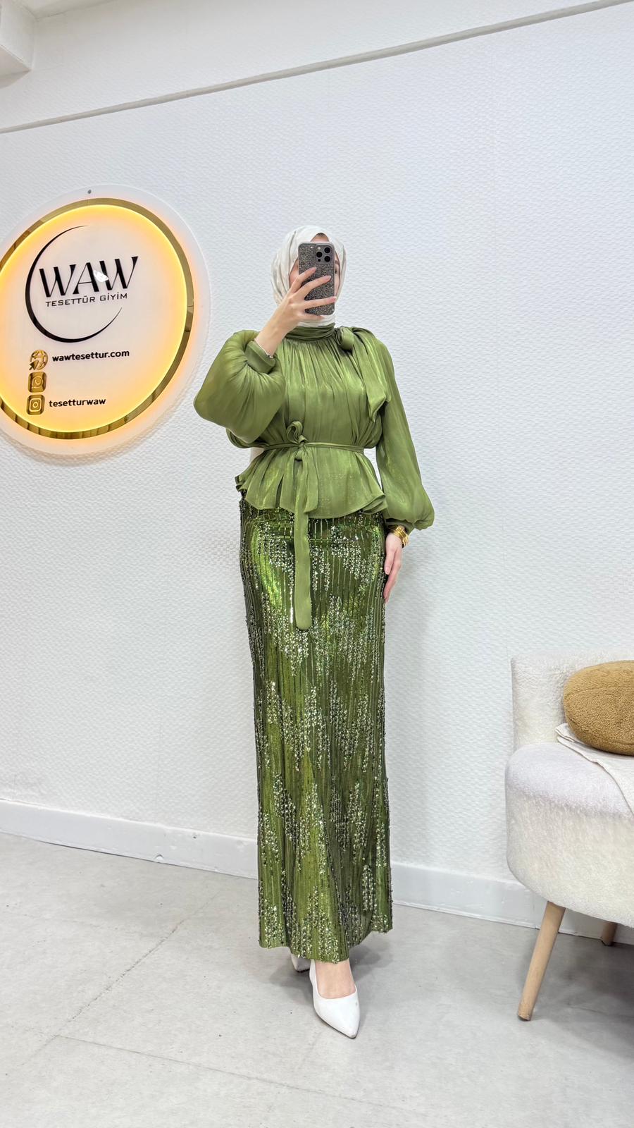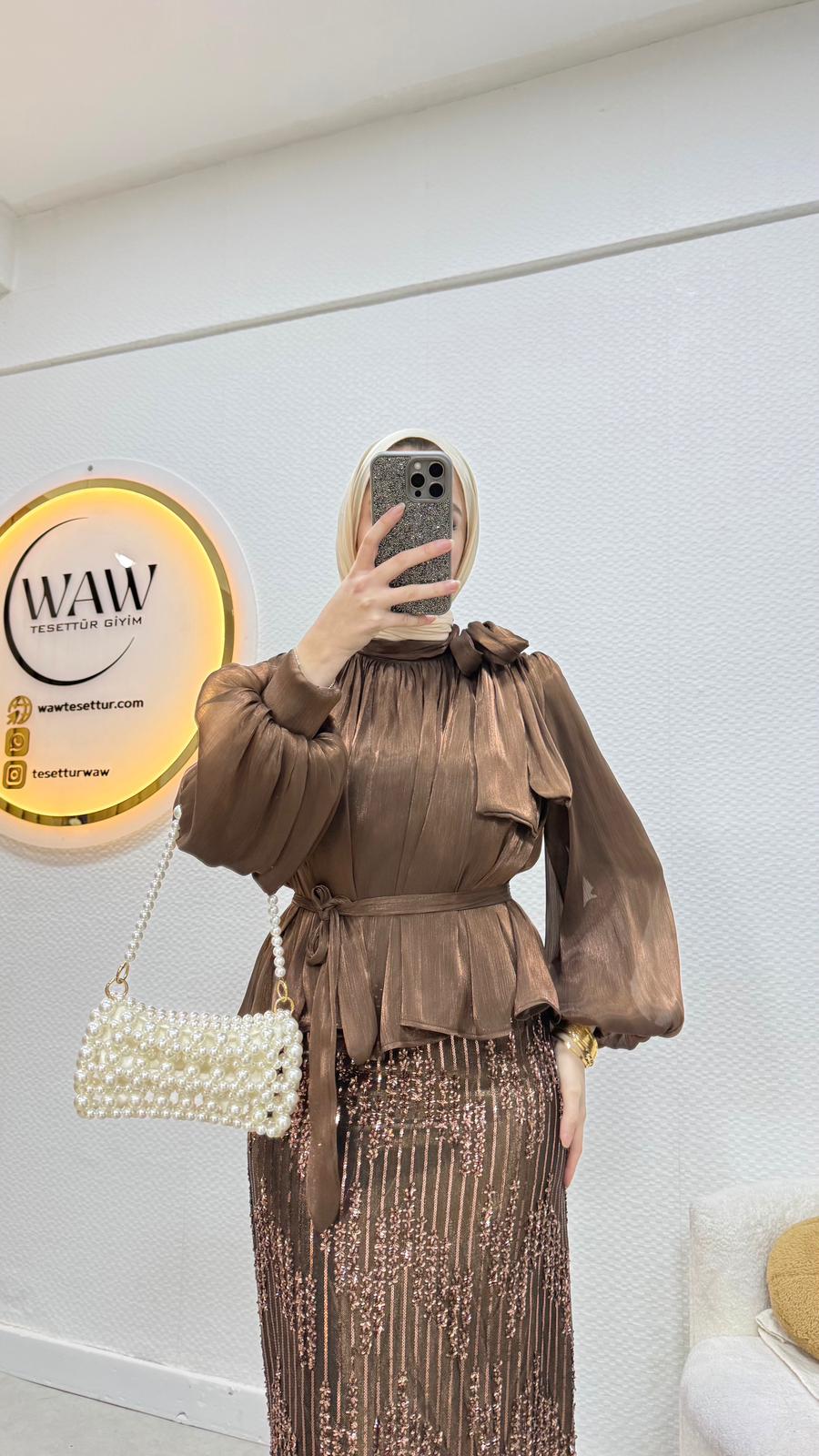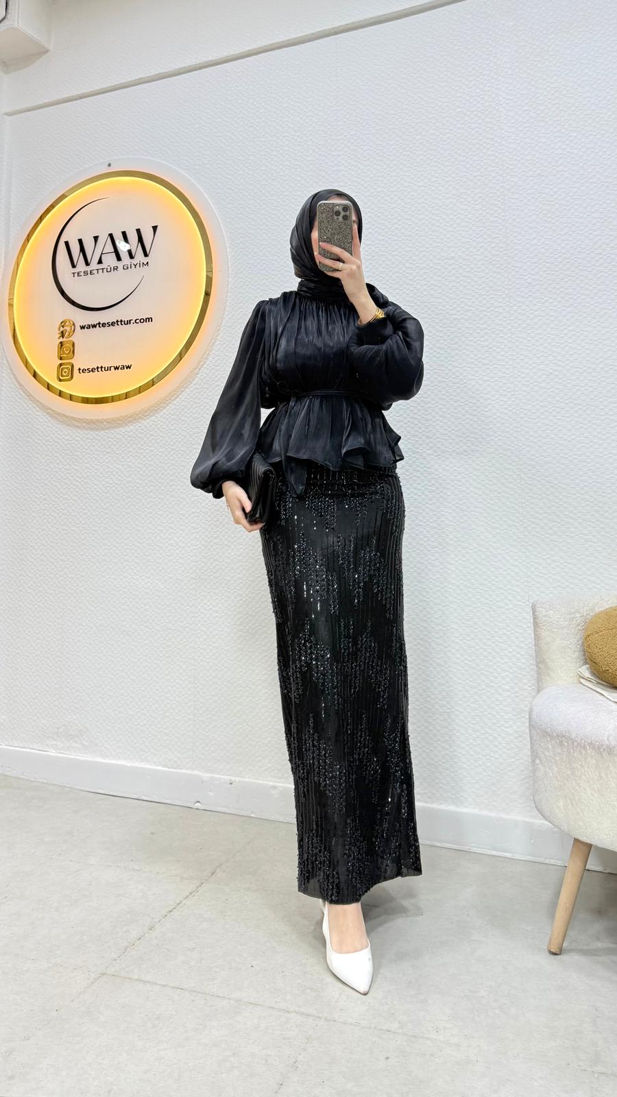 Etek payetli taşlı kumaş,Üstü Sofia kumaştan üretilmiştir