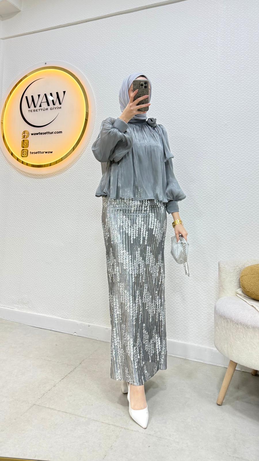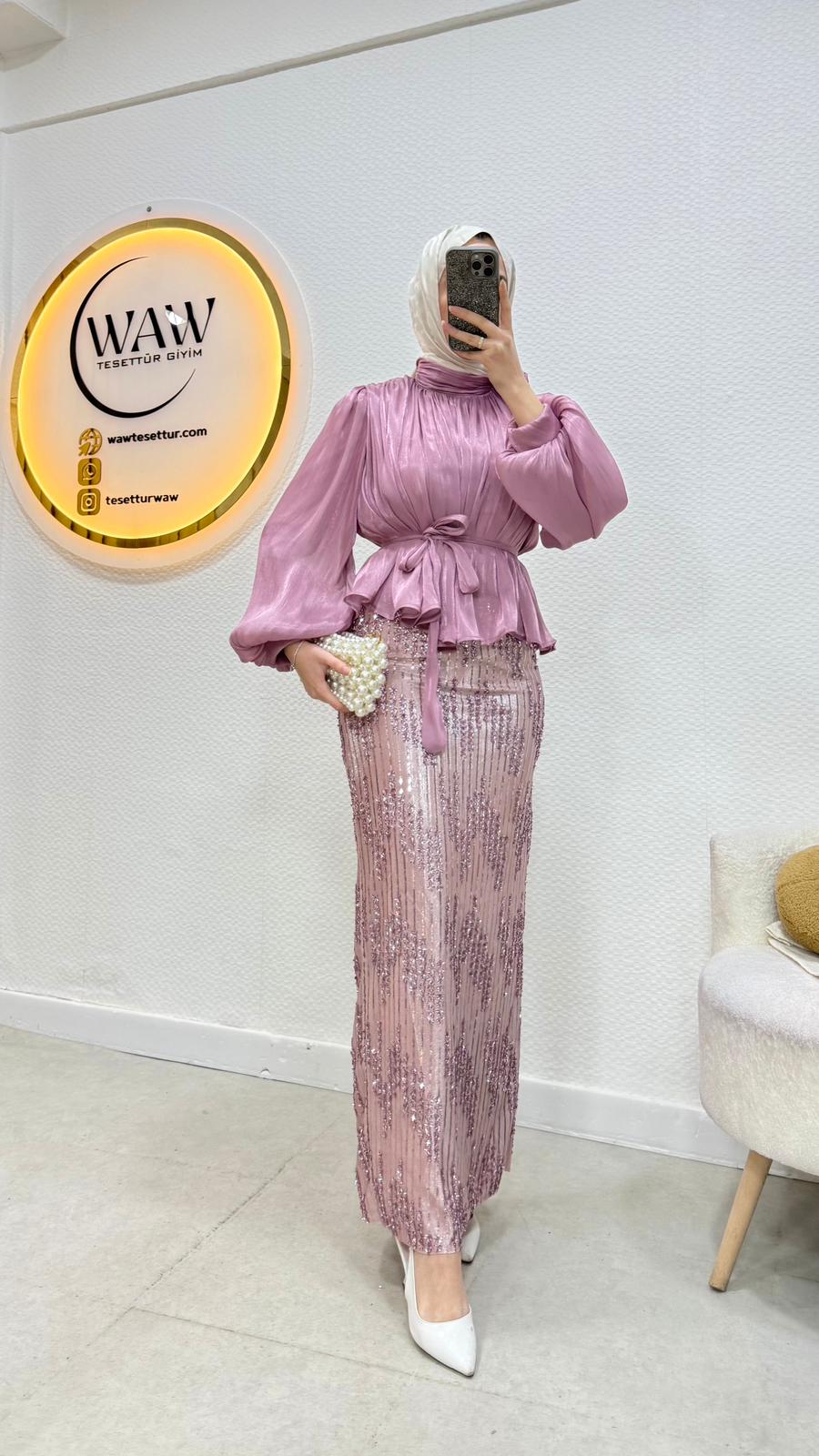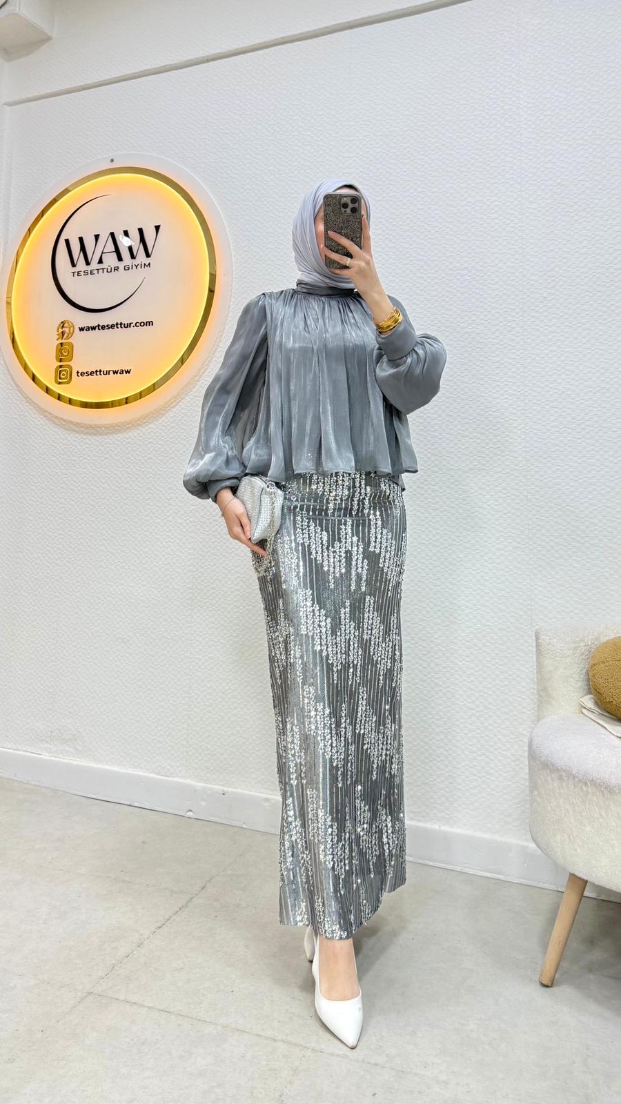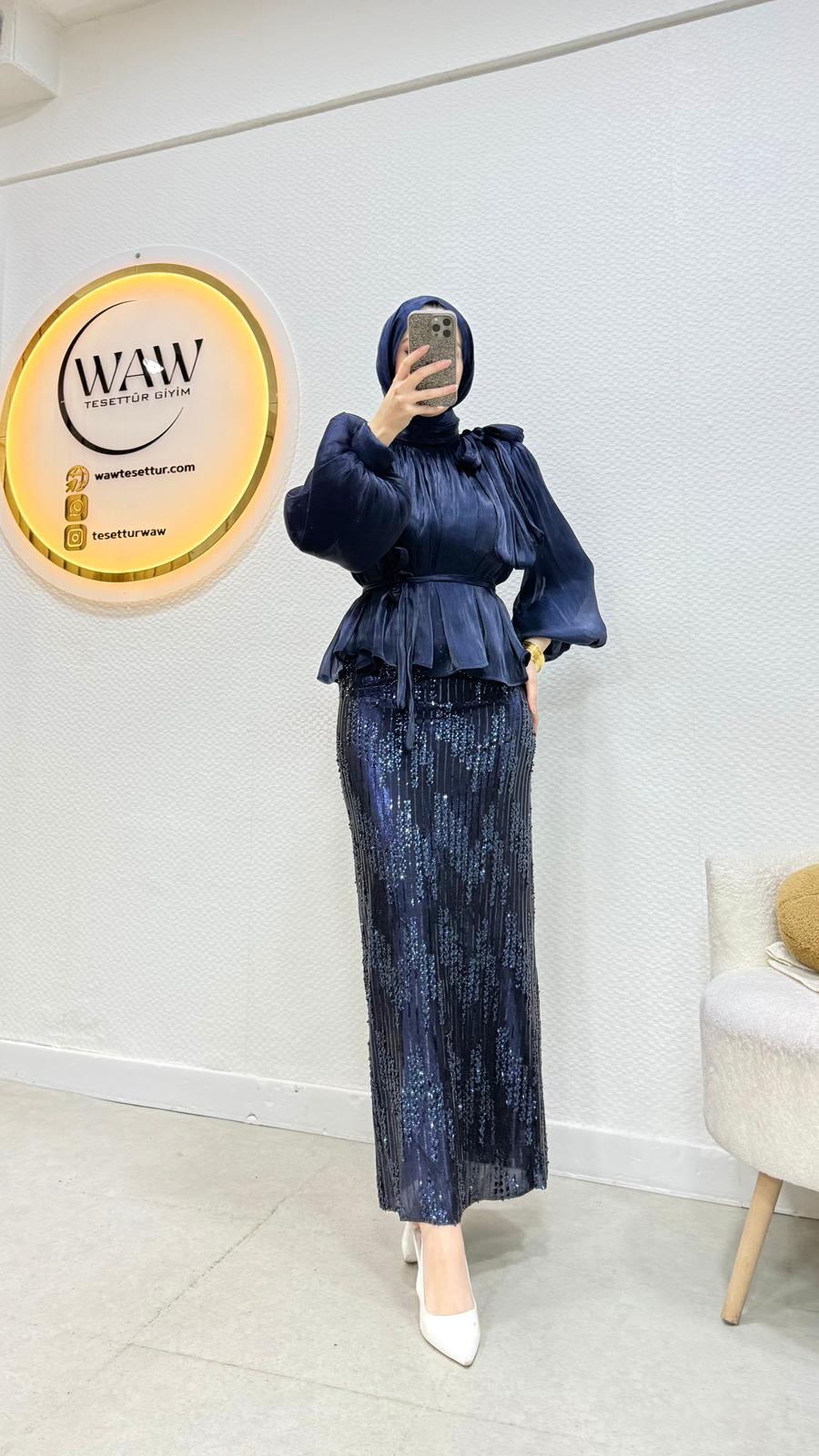 Etek payetli taşlı kumaş,Üstü Sofia kumaştan üretilmiştir