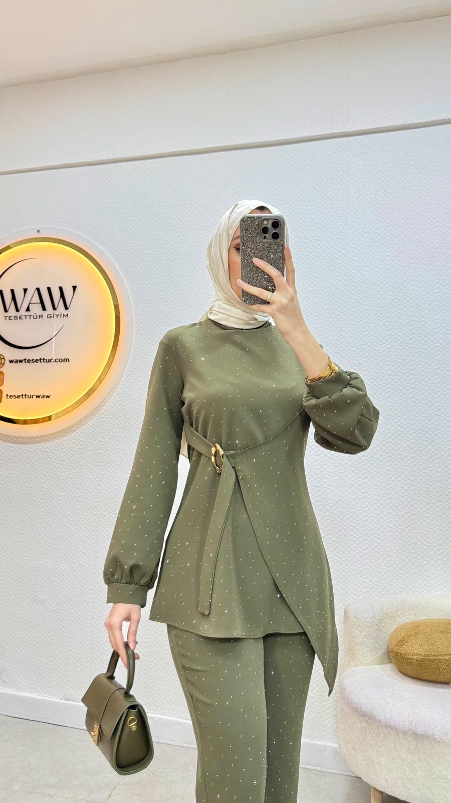 Tunik broş detaylıdır ve asimetrik kesimdir.