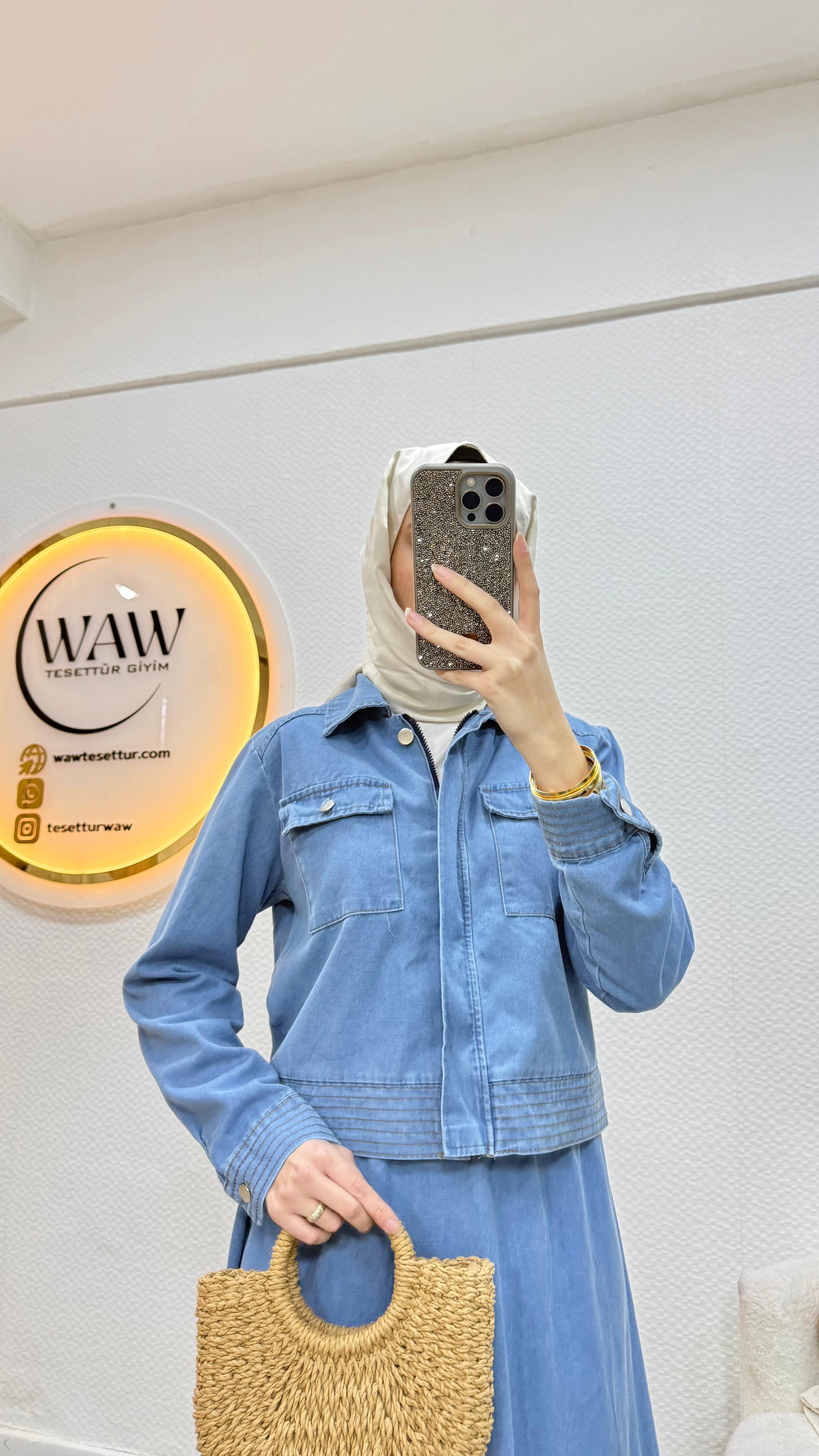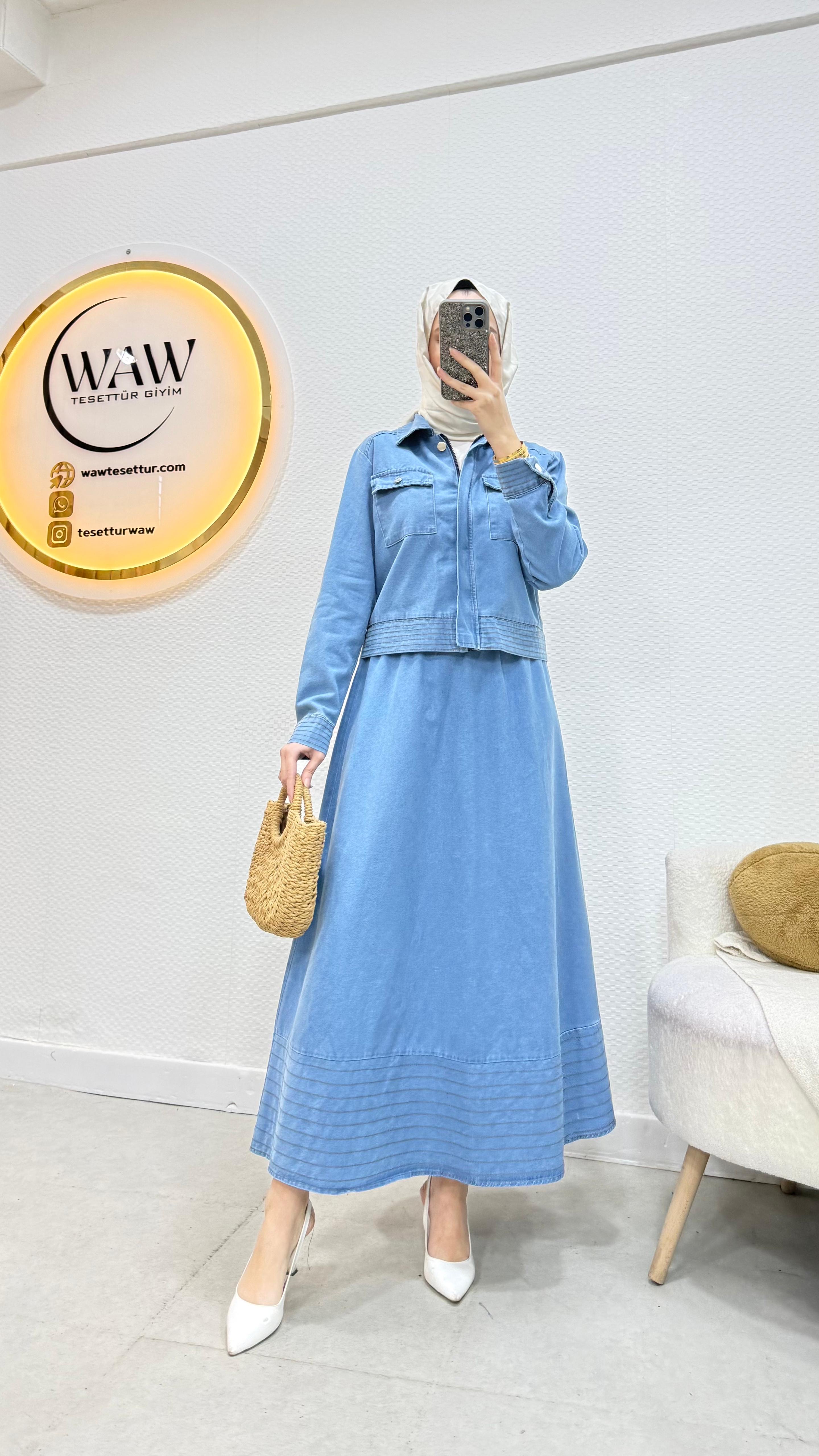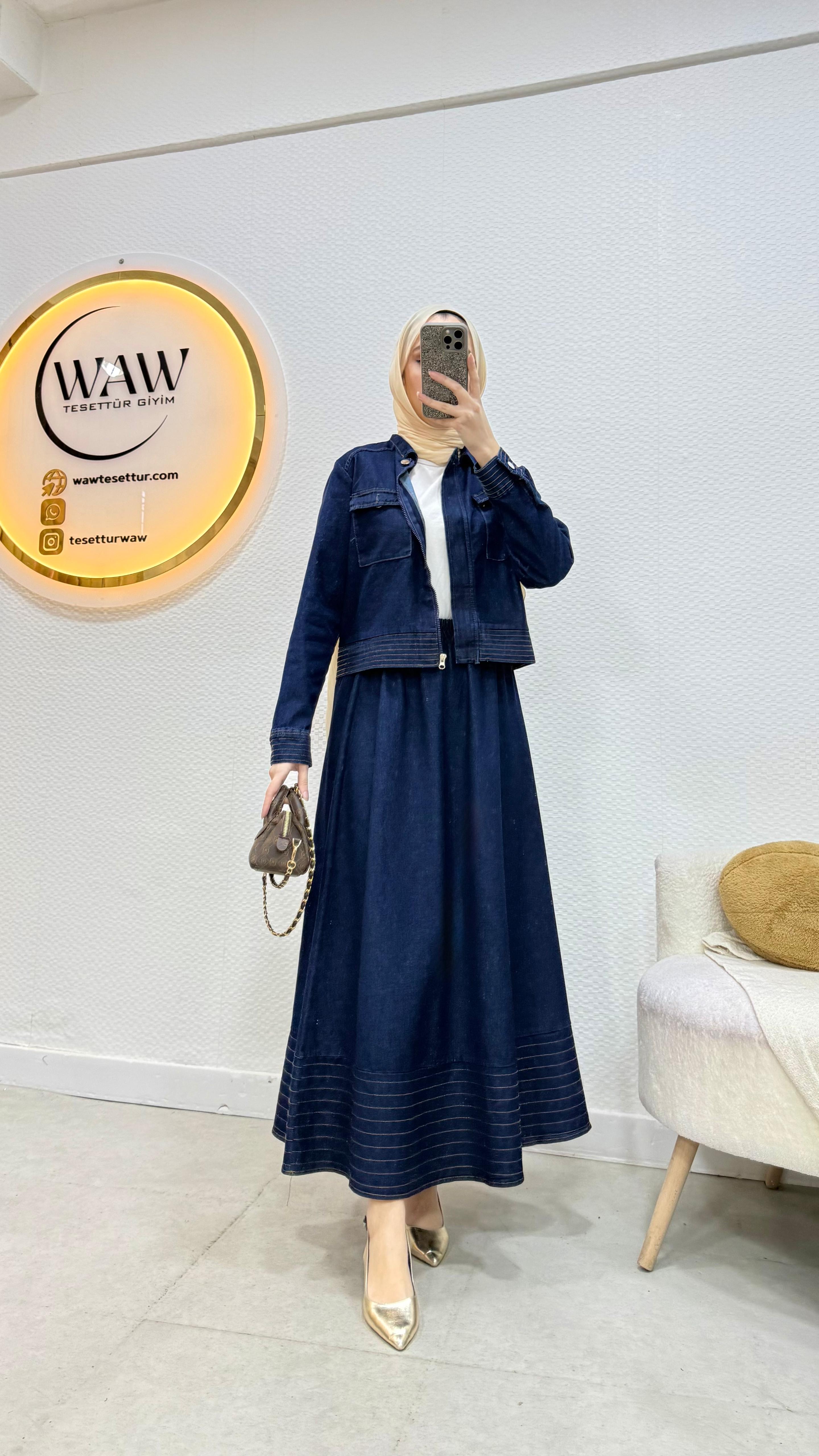 Ceket ve etek şeklinde ikili takımdır.