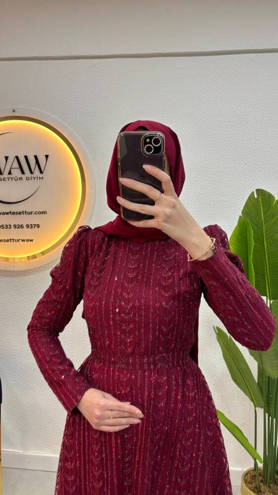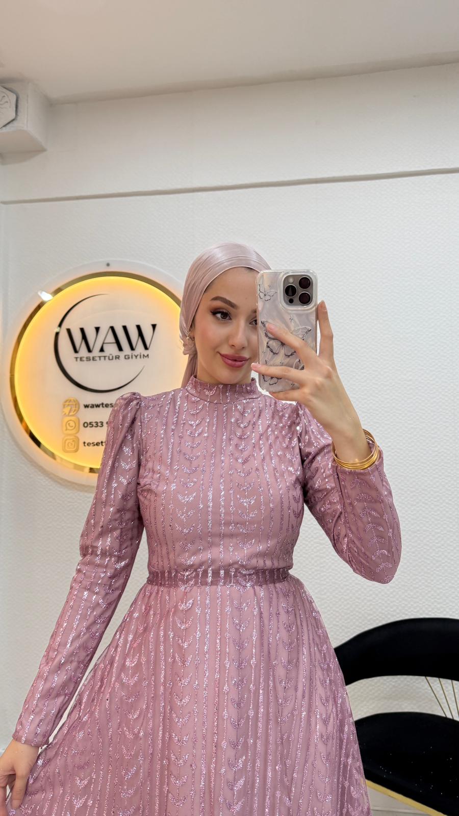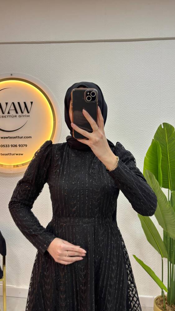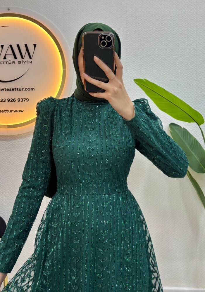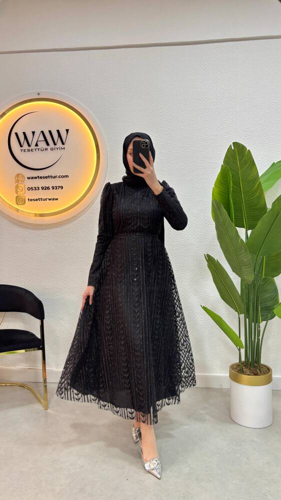 Simli tül kumaştan imal edilmiştir. Kumaş yoğun simden oluşmaktadır. Fazla simleri dökülme yapıp, dökülmeyi bırakacaktır. Dört mevsim tercih edebilirsiniz. Astarlıdır, iç göstermez. Yarım hakim yakadır. Sırttan kullanılabilir fermuarı mevcuttur. Kemer ürüne dahildir. 36/38/40/42/44/46/48 bedenler mevcuttur. Ürün boyu 135cm’dir. Manken 170/60kg 38 beden tercih etmektedir.