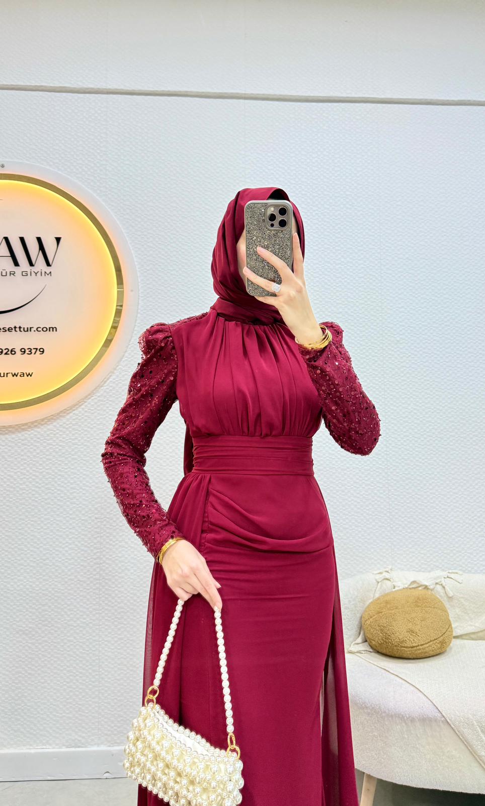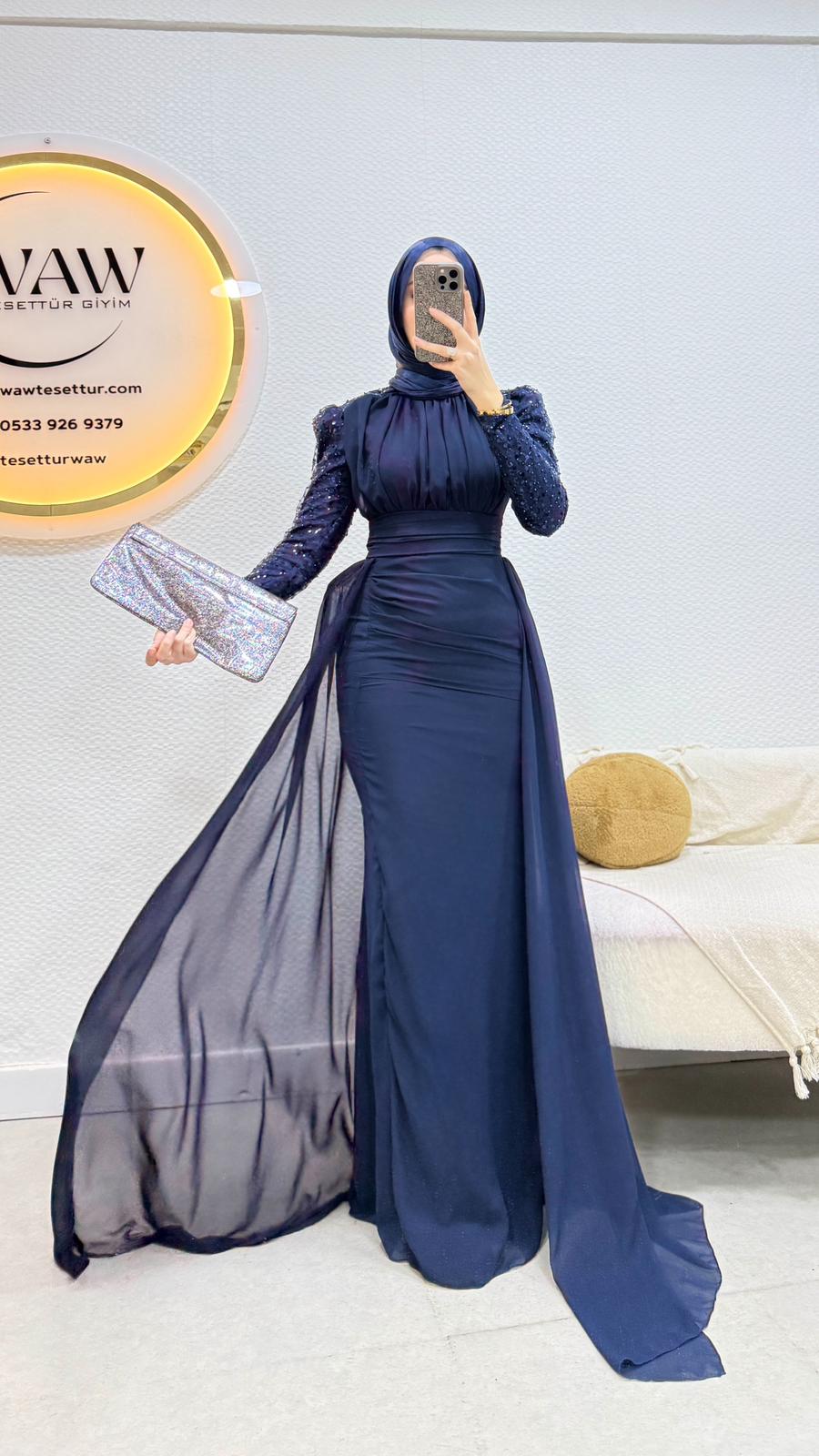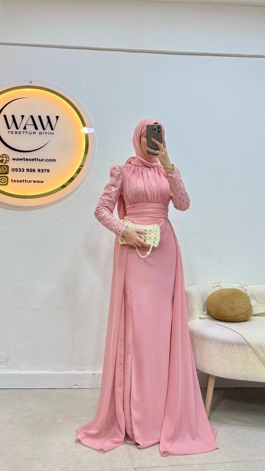 Şifon kumaştan üretilmiştir Kolları boru Payet kumaştır Seyyar kemerlidir Pelerinlidir Arka orta gizli fermuarlıdır 36/38/40/42/44 bedenler mevcuttur. manken 170/60 kilo 38 beden tercih etmektedir
