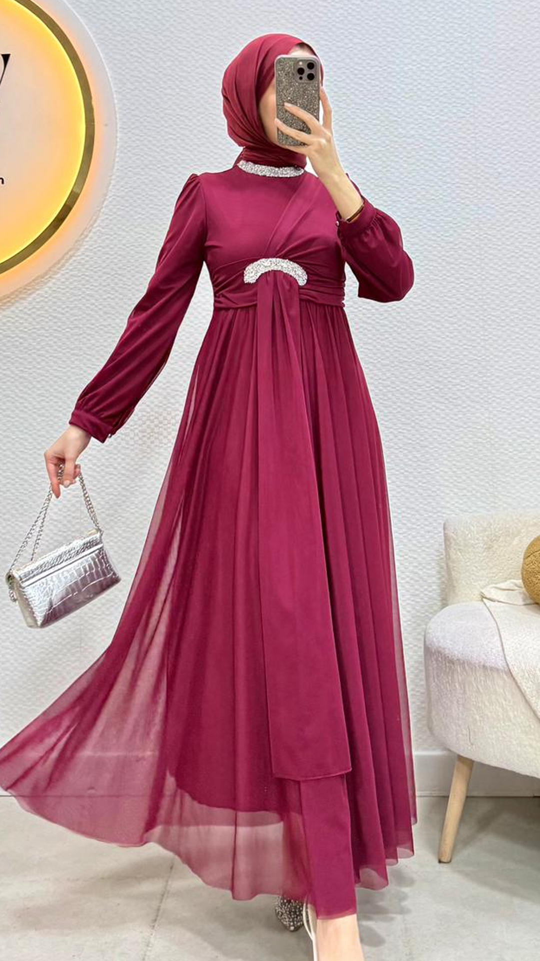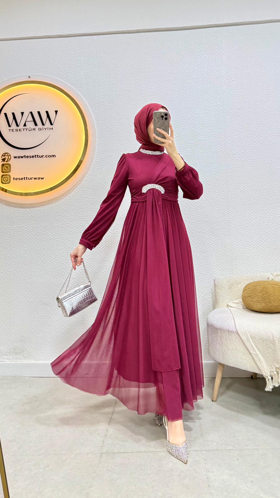 Ürünümüzün kumaşı tül kumaştır Boynunda ve kemer kımında taş detayları vardır Tam kalıptırArka orta gizli fermuarlıdr 36/38/40/42/44 bedenleri mevcut Çekim mankeni 170/60kg 38 beden tercih etmektedir