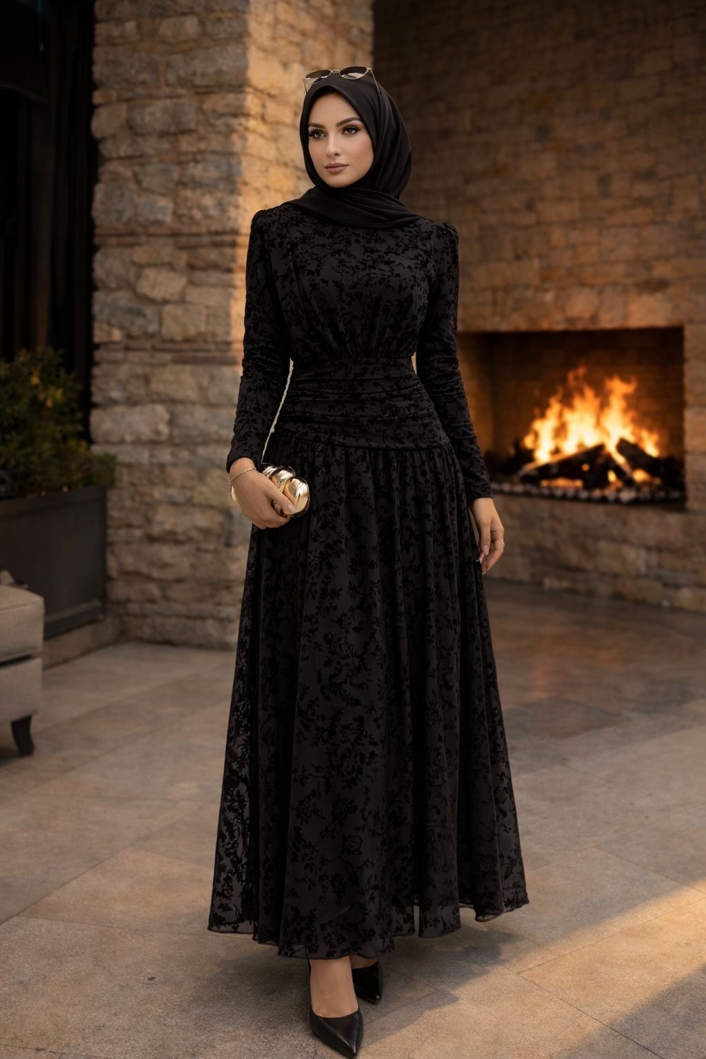 Likra filok baskı tül kumaştır.Yandan fermuarlıdır Boy:140cm Beden: tam kalıp Bedenler 36/38/40/42/44/46 Mankenin tercih ettiği beden 38
