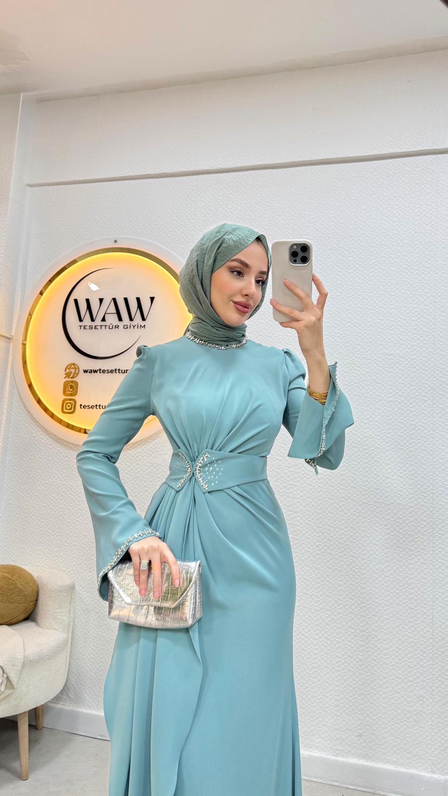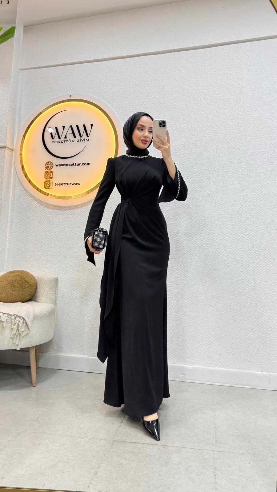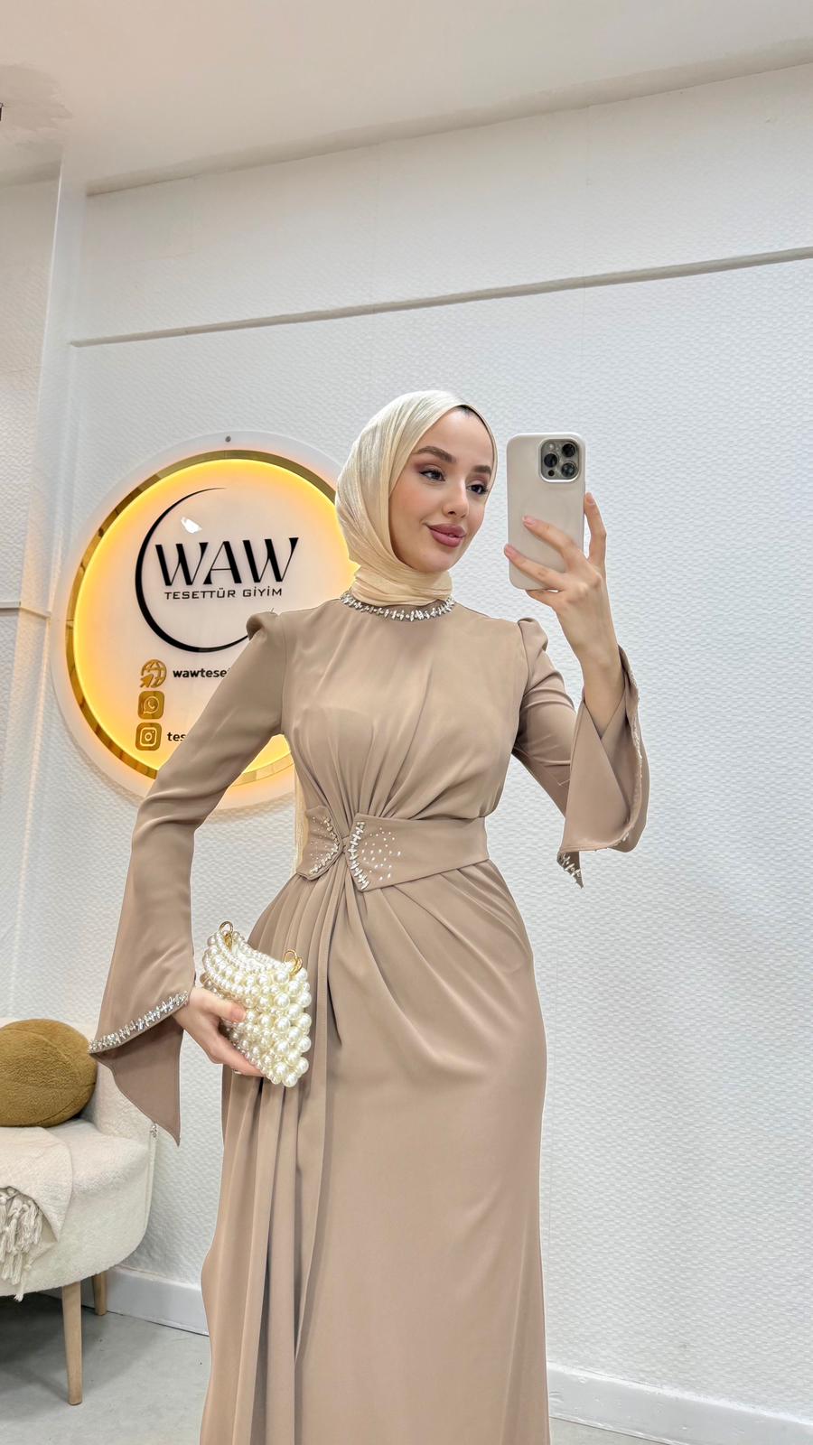 Belinde,boynunda ve manşet kısımlarında taş detaylar mevcuttur.