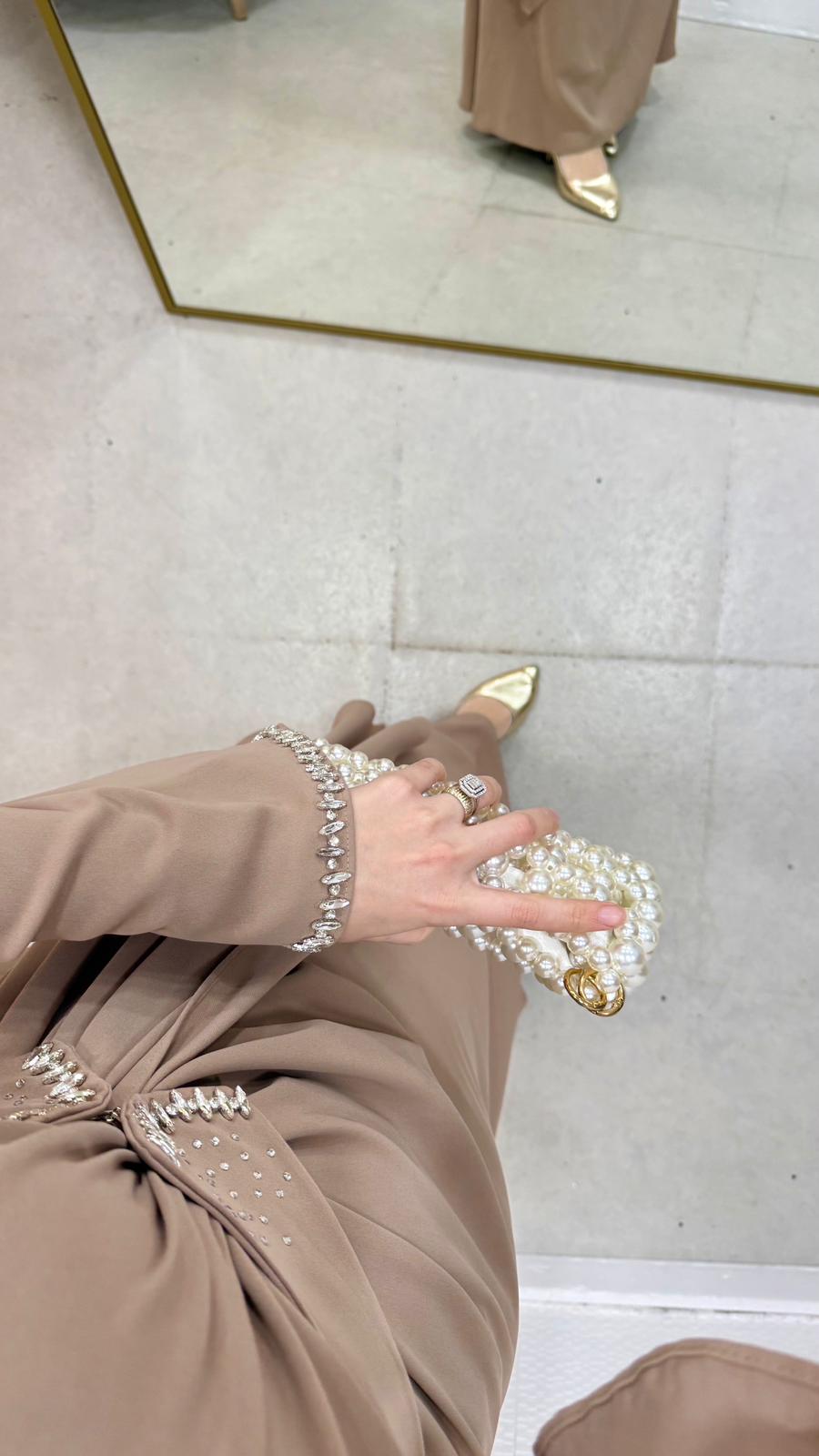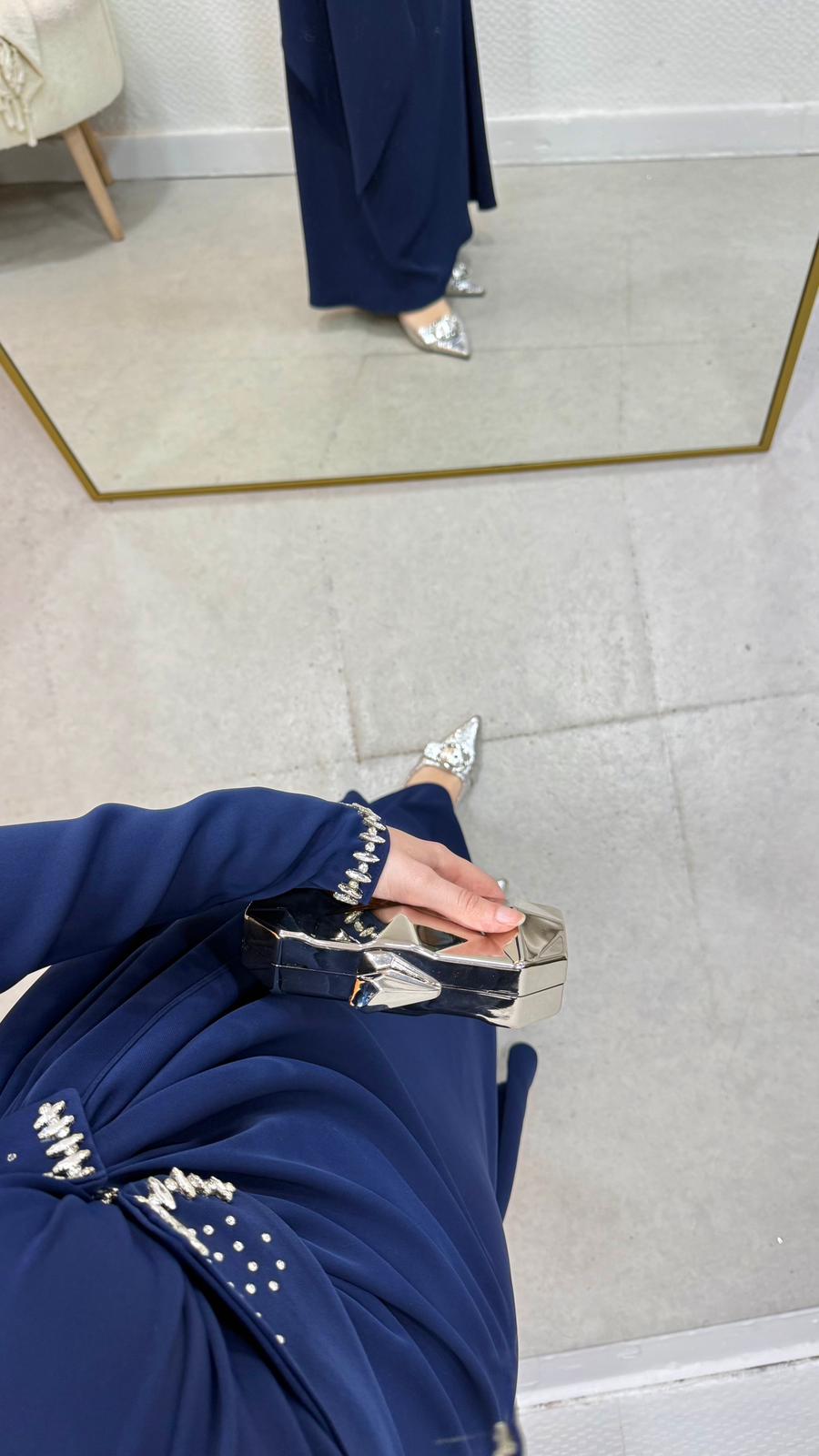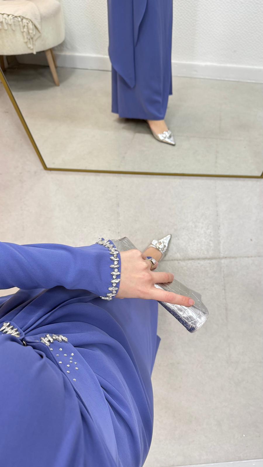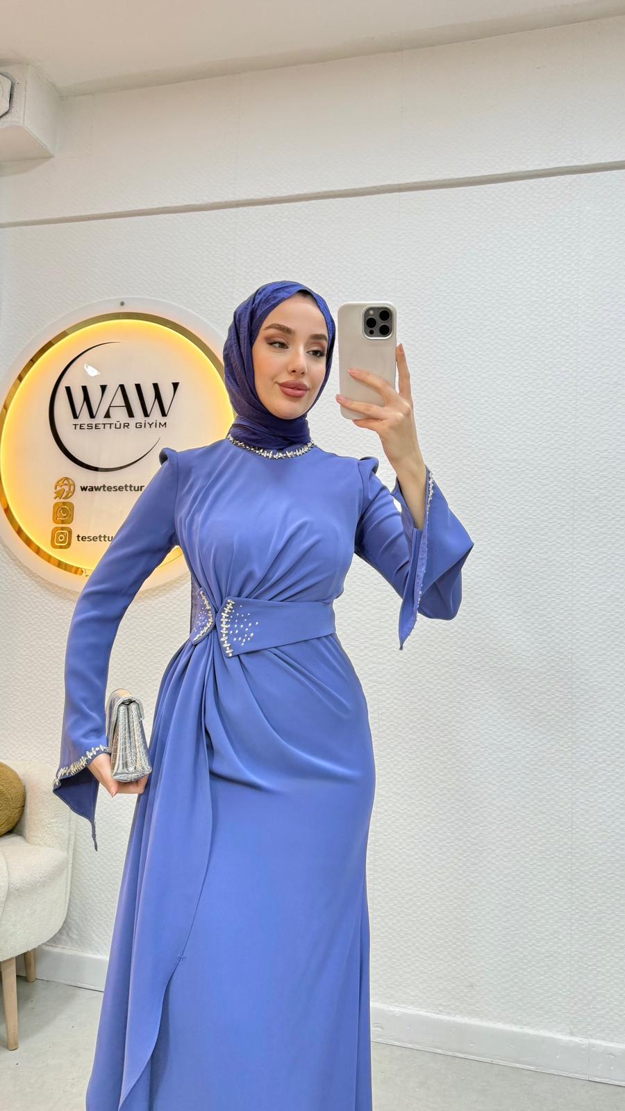 Belinde,boynunda ve manşet kısımlarında taş detaylar mevcuttur.