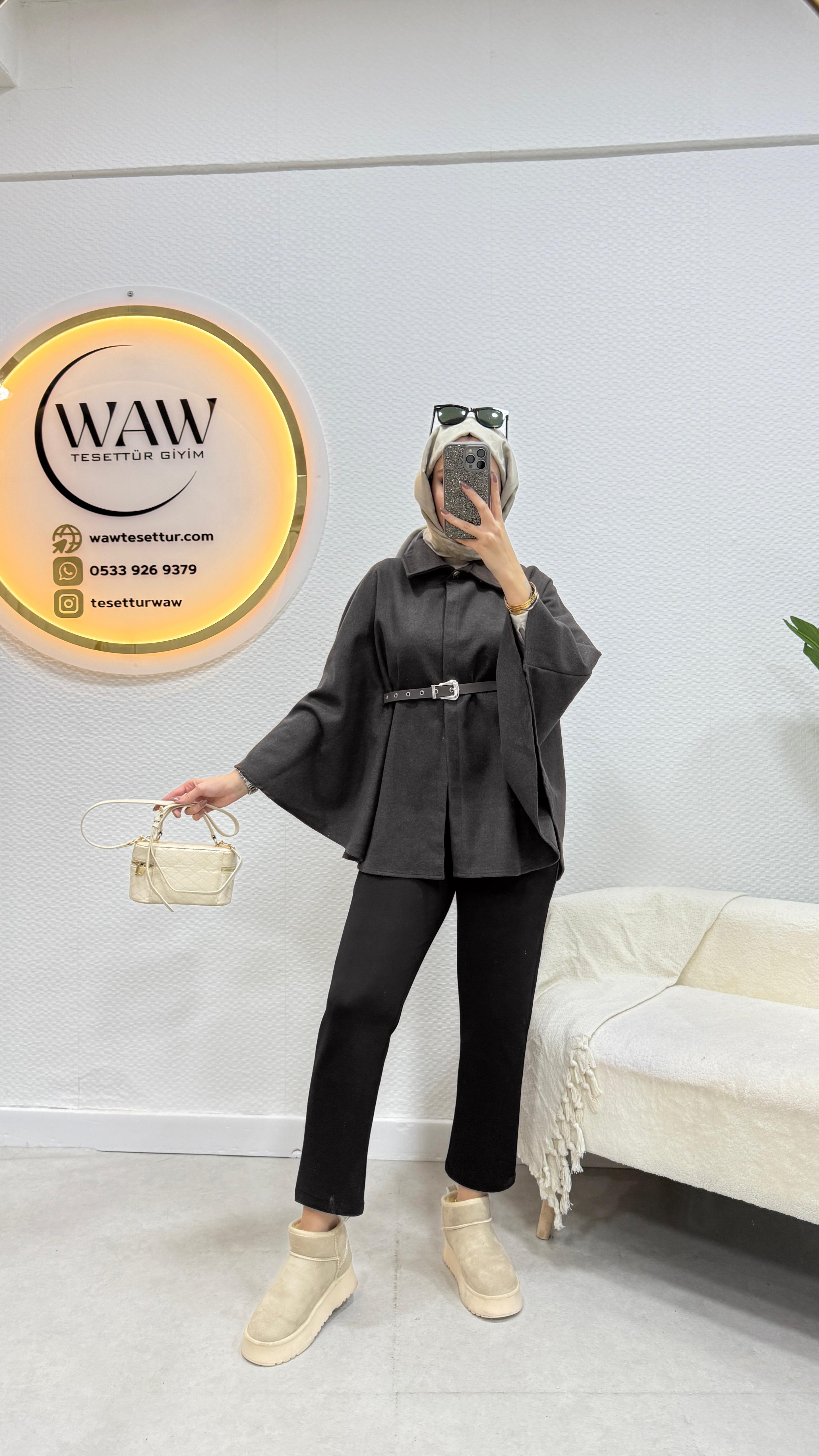 Kaşe kumaştan üretilmiştir Seyyar kemerlidirBoyu 70cm’dirYarasa kol detaylıdır Standart bedendir Çekim mankeni 170/60kg’dır