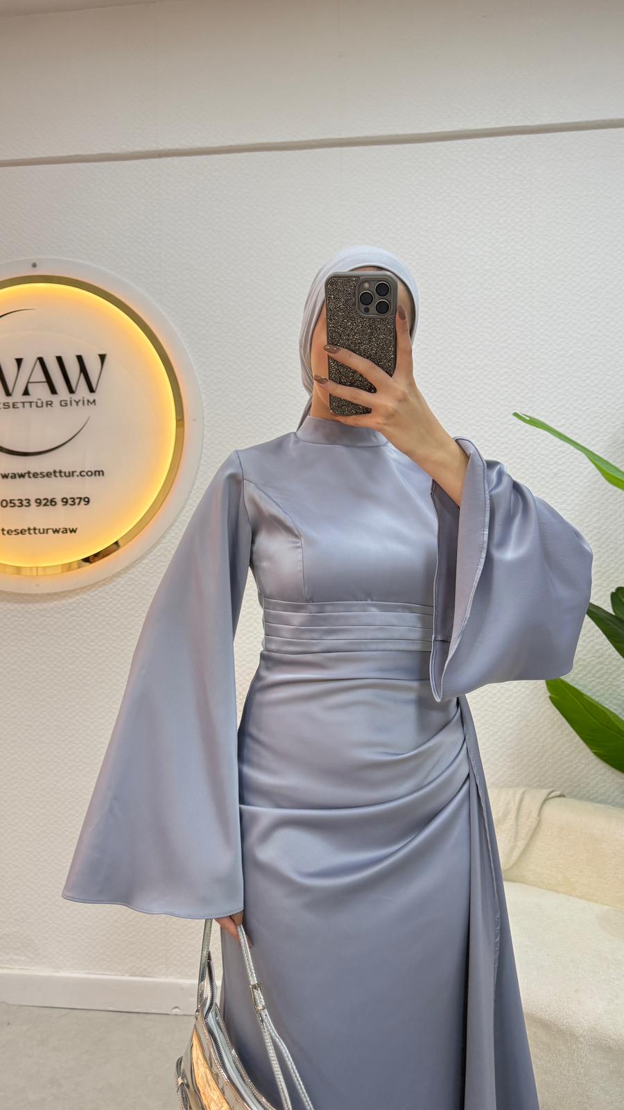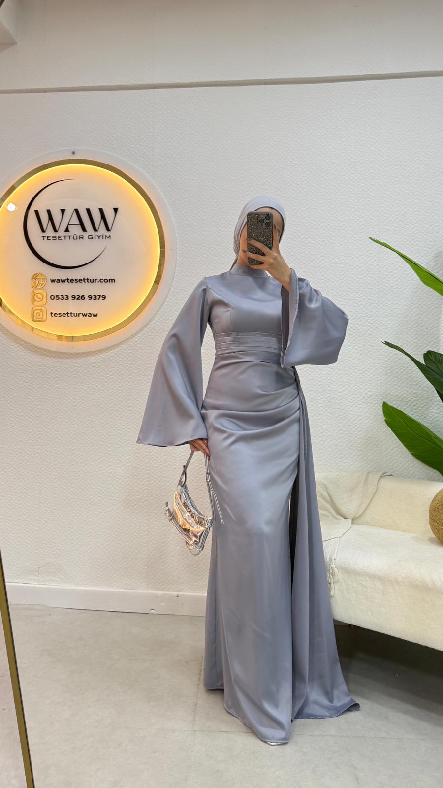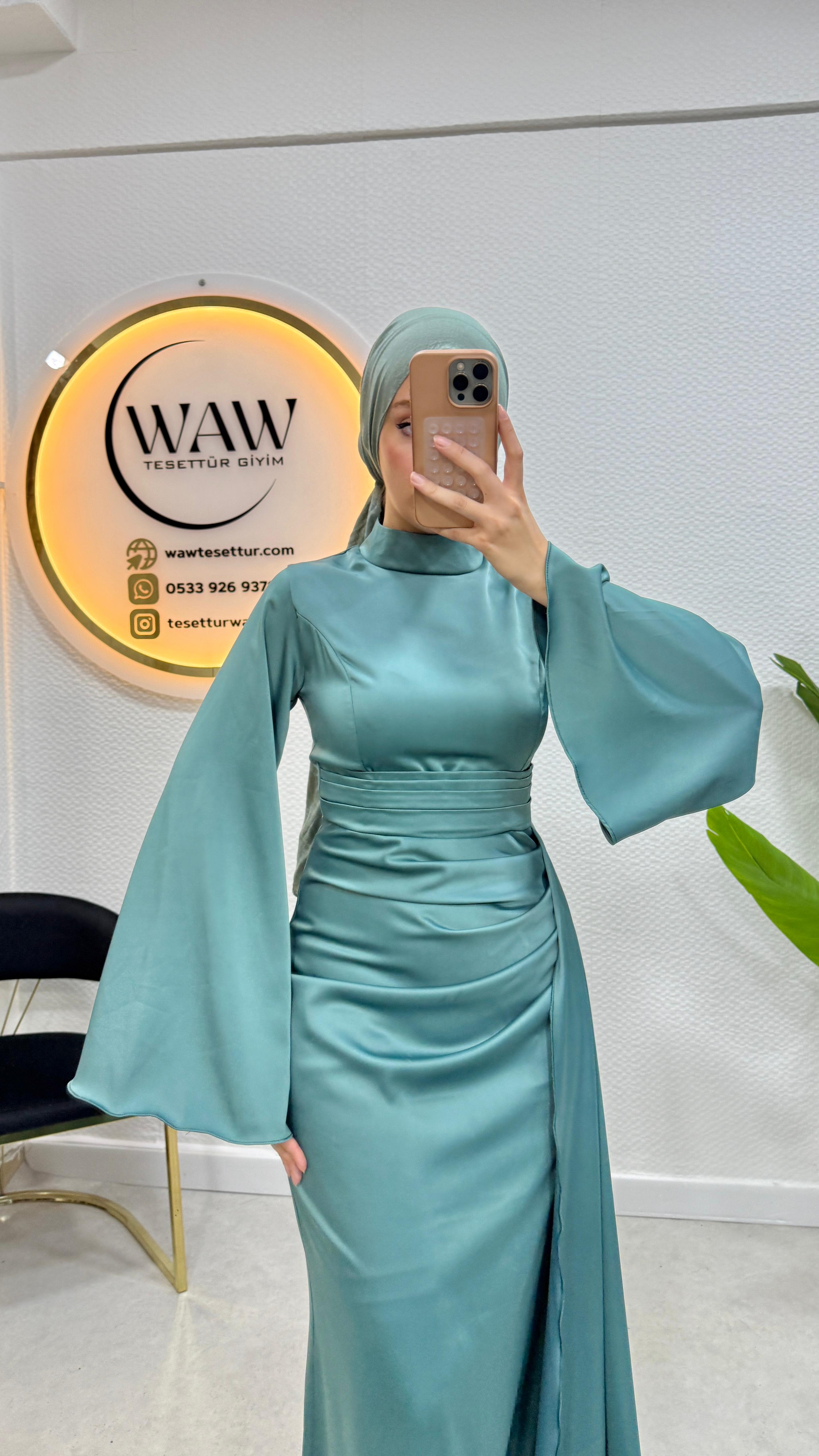 Ürünümüz 1. kalite saten kumaştan üretilmiştir. İspanyol kol detaylıdır. Kuyrukludur. Bel kemerlidir. Arka orta gizli fermuarlıdır. Ürün boyu 140cm’dir. 36/38/40/42/44 bedenler mevcuttur. Manken 170/50kg 38 beden tercih etmiştir.