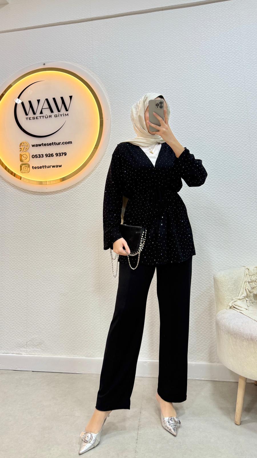 Ürünümüz birinci kalite oyso kumaştan üretilmiştir. Taş detaylıdır. 36/38/40/42/44 bedenler mevcuttur. Pantolon bel lastiklidir. Bel tünelli bağlama detaylıdır.