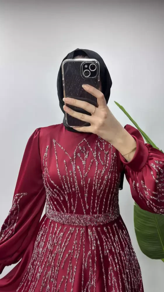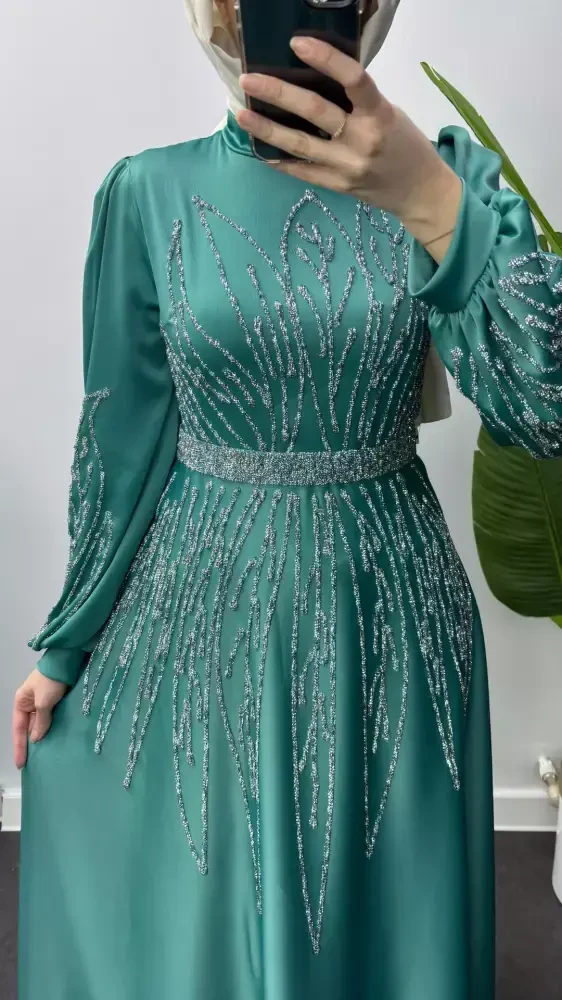 Ürünümüz 1. Kalite saten kumaştan üretilmiştir. Taş işlemelidir. Manşet detaylıdır. Seyyar kemeri mevcuttur. Bisiklet yakadır. Arka orta gizli fermuarlıdır. Ürün boyu 140cm’dir. Manken 170cm 60kg 38 beden giymektedir.