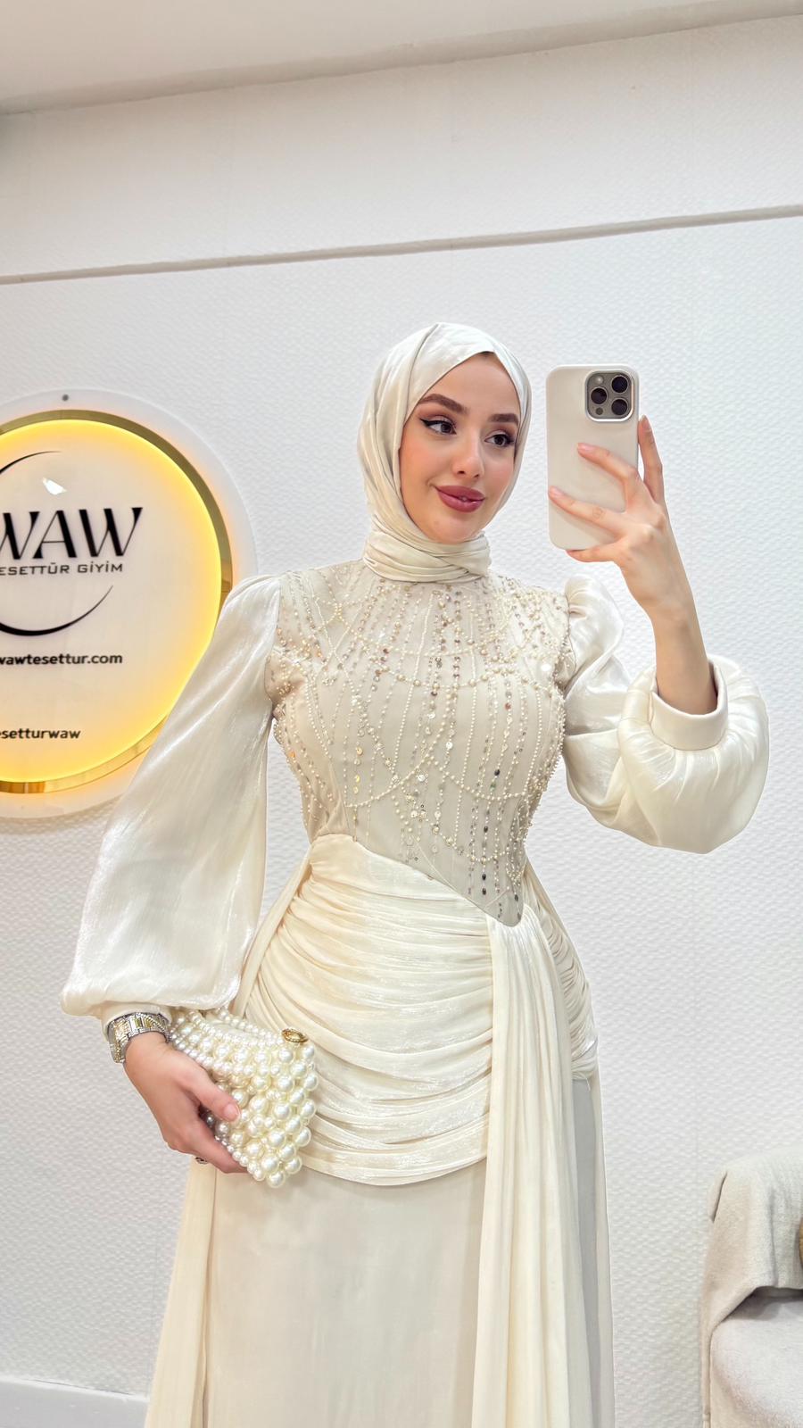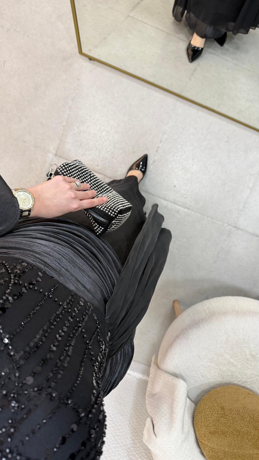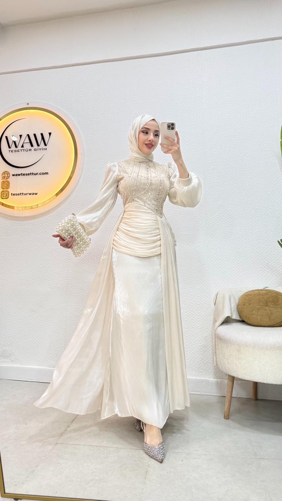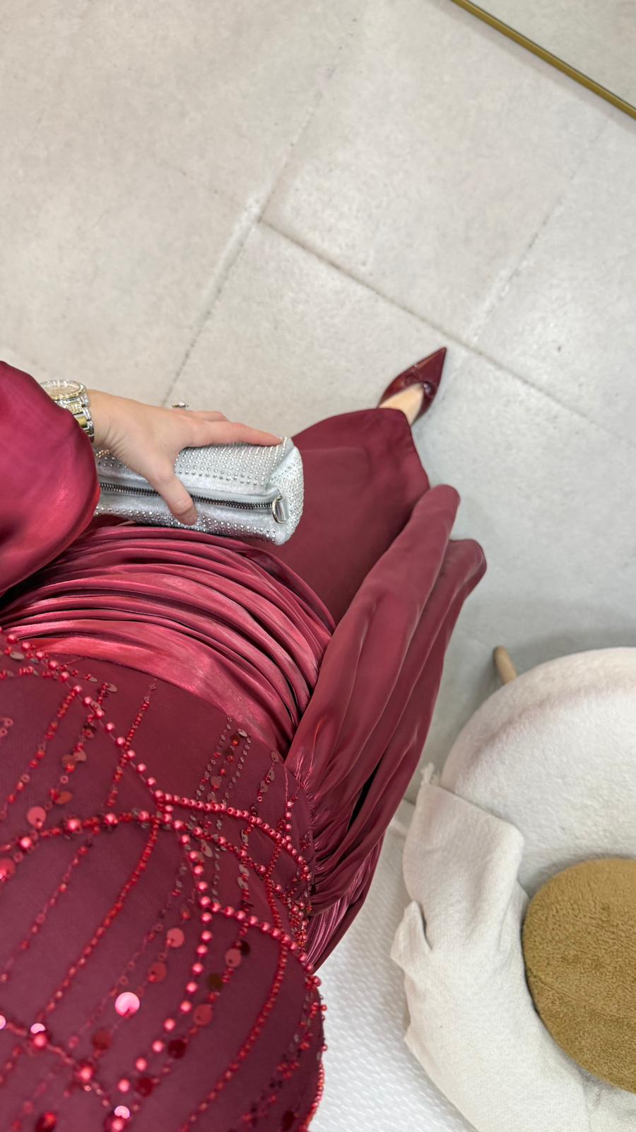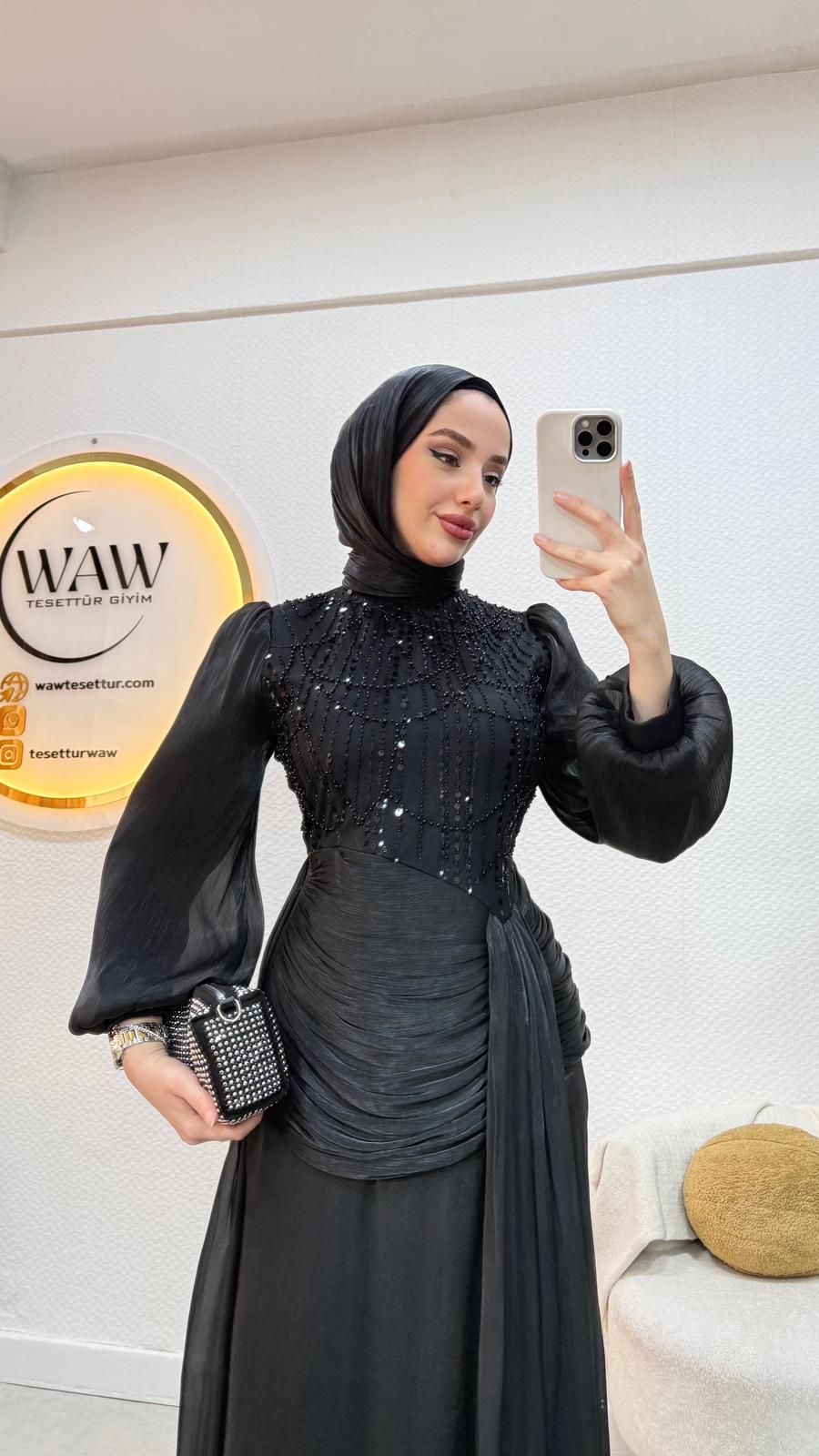 Janjan payet kumaştan üretilmiştir Balon koldur Orta arka gizli fermuarlıdır Tam kalıptır Boy:145 Beden 36/38/40/42/44