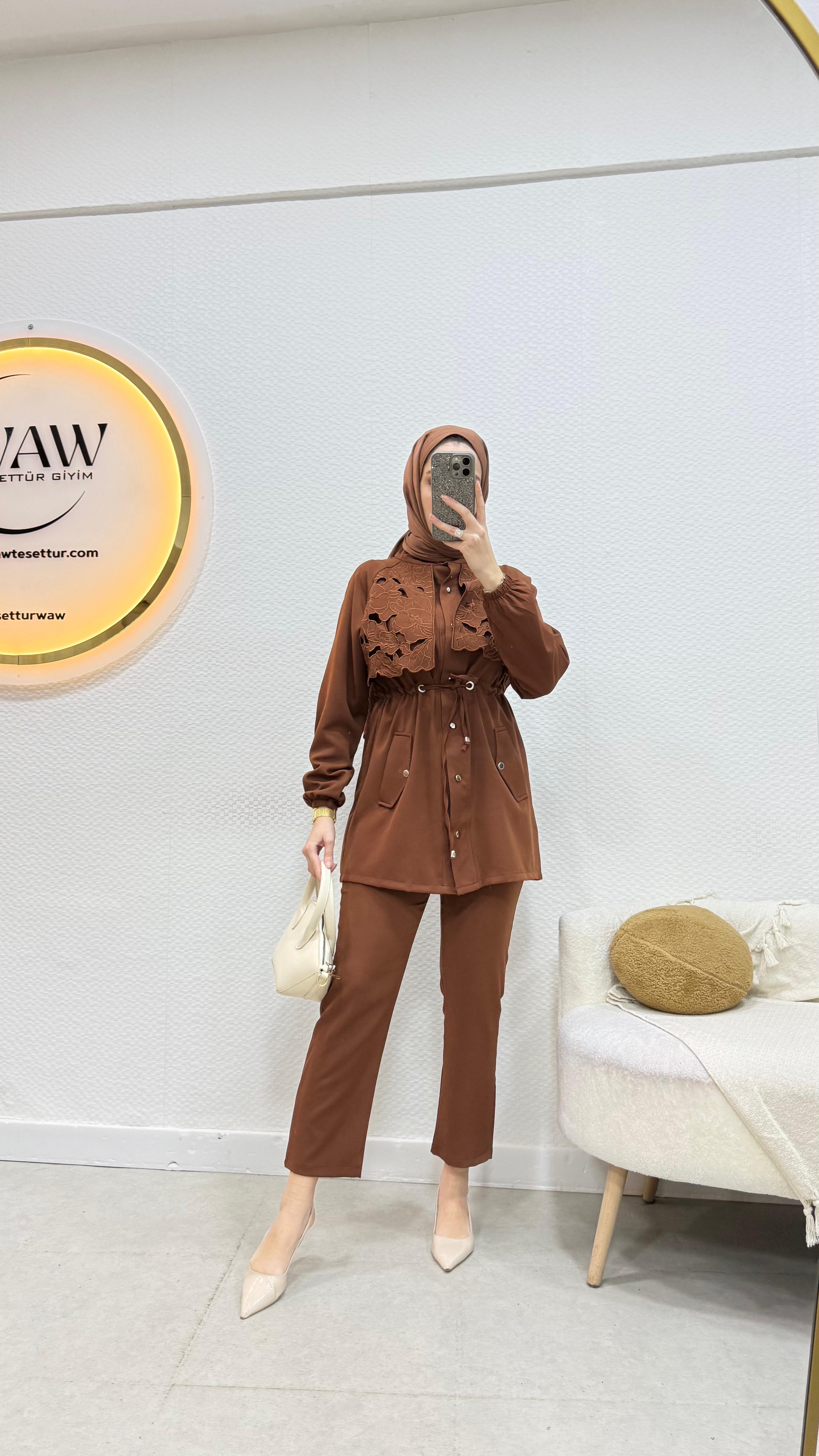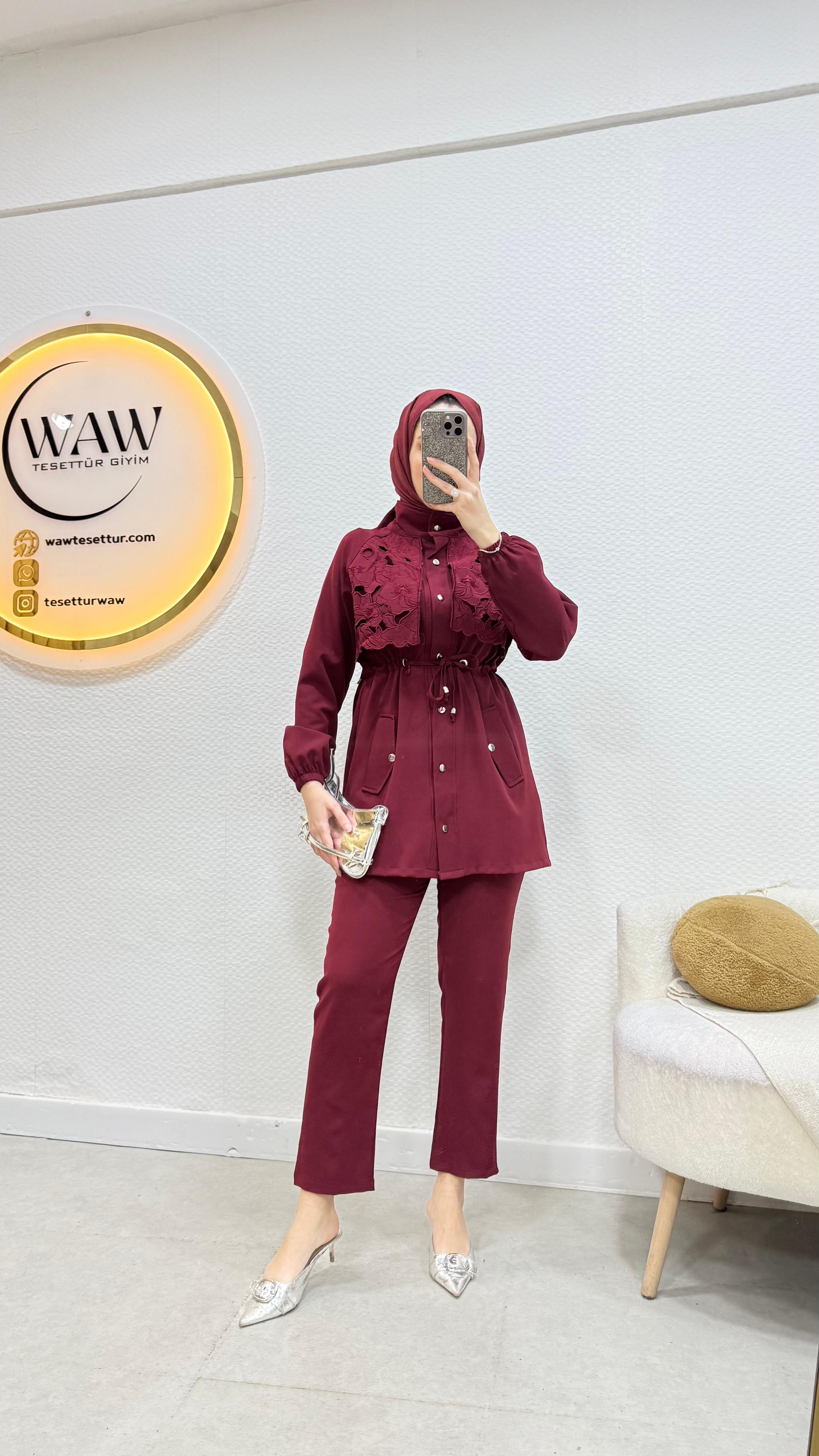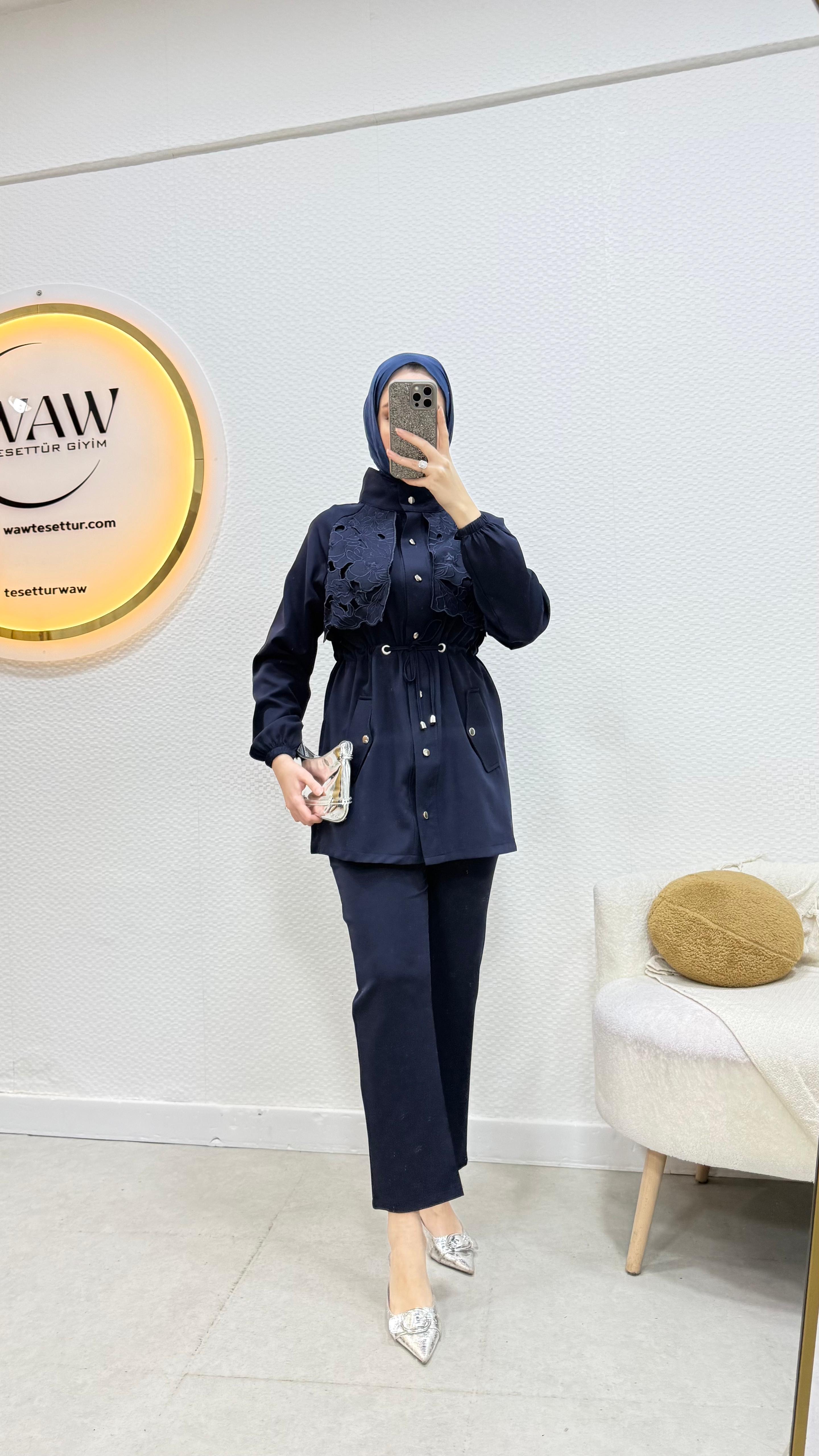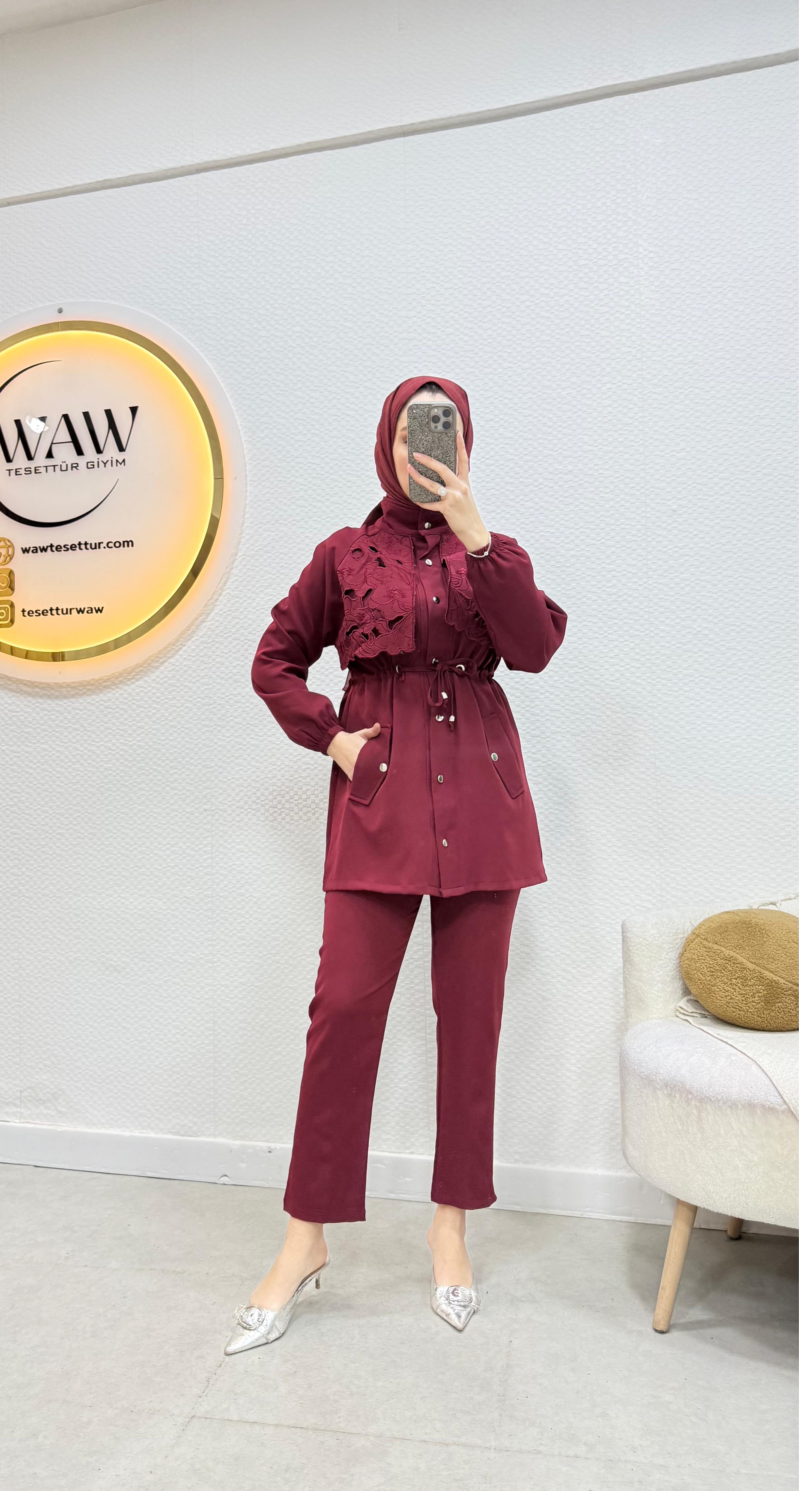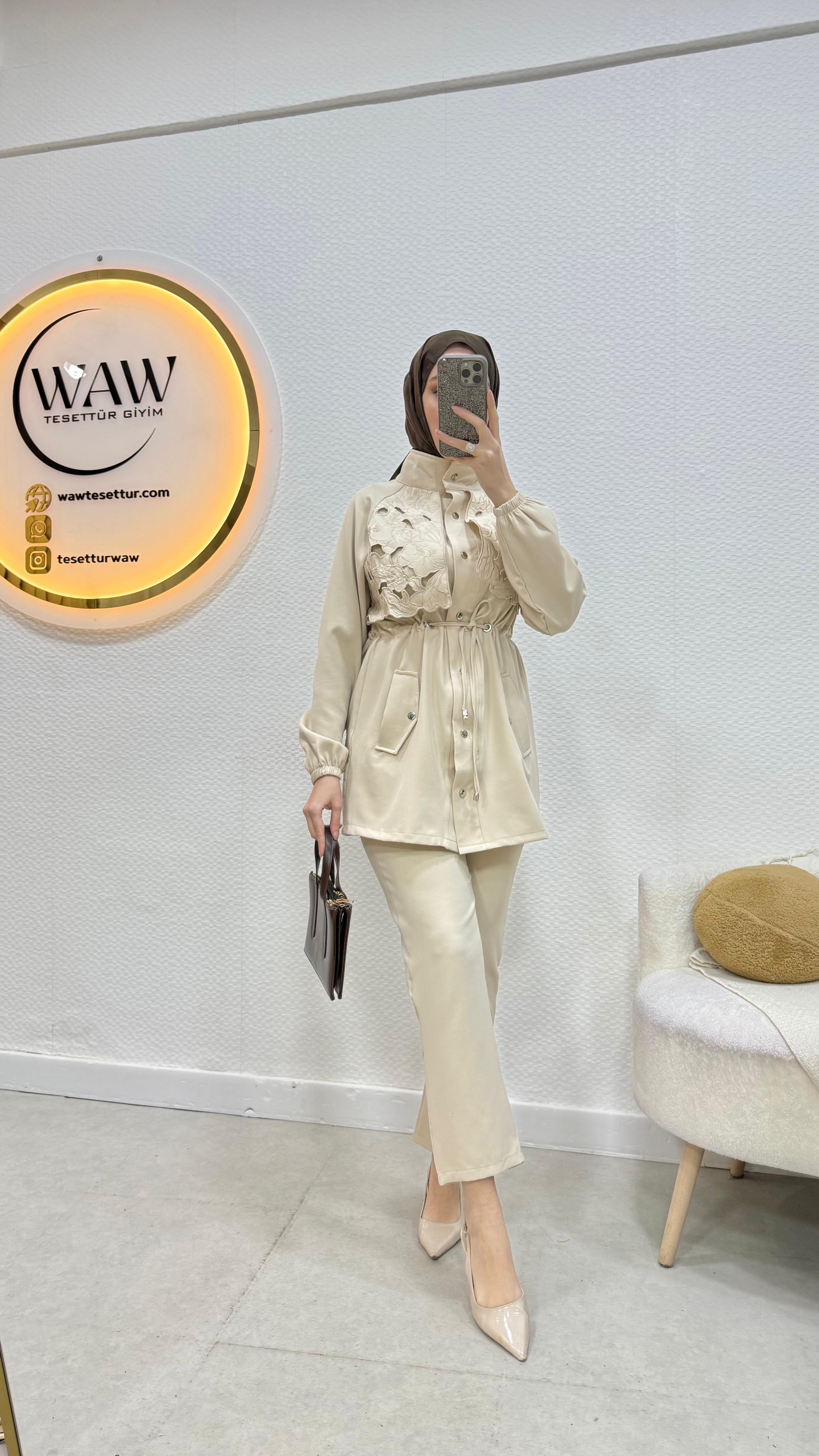 Gelince Haber VerYaprak Takım ürünümüz 1. kalite dabıl krep kumaştan üretilmiştir. 36/38/40/42/44 bedenler mevcuttur. Tam kalıptır. Pantolon bel lastiklidir. Bel bağlama detaylıdır. Manşet lastiklidir. Düğmelidir; düğmeler kullanılabilir. Manken 170/60kg 38 giymektedir. üst 80 alt 90cmdir.