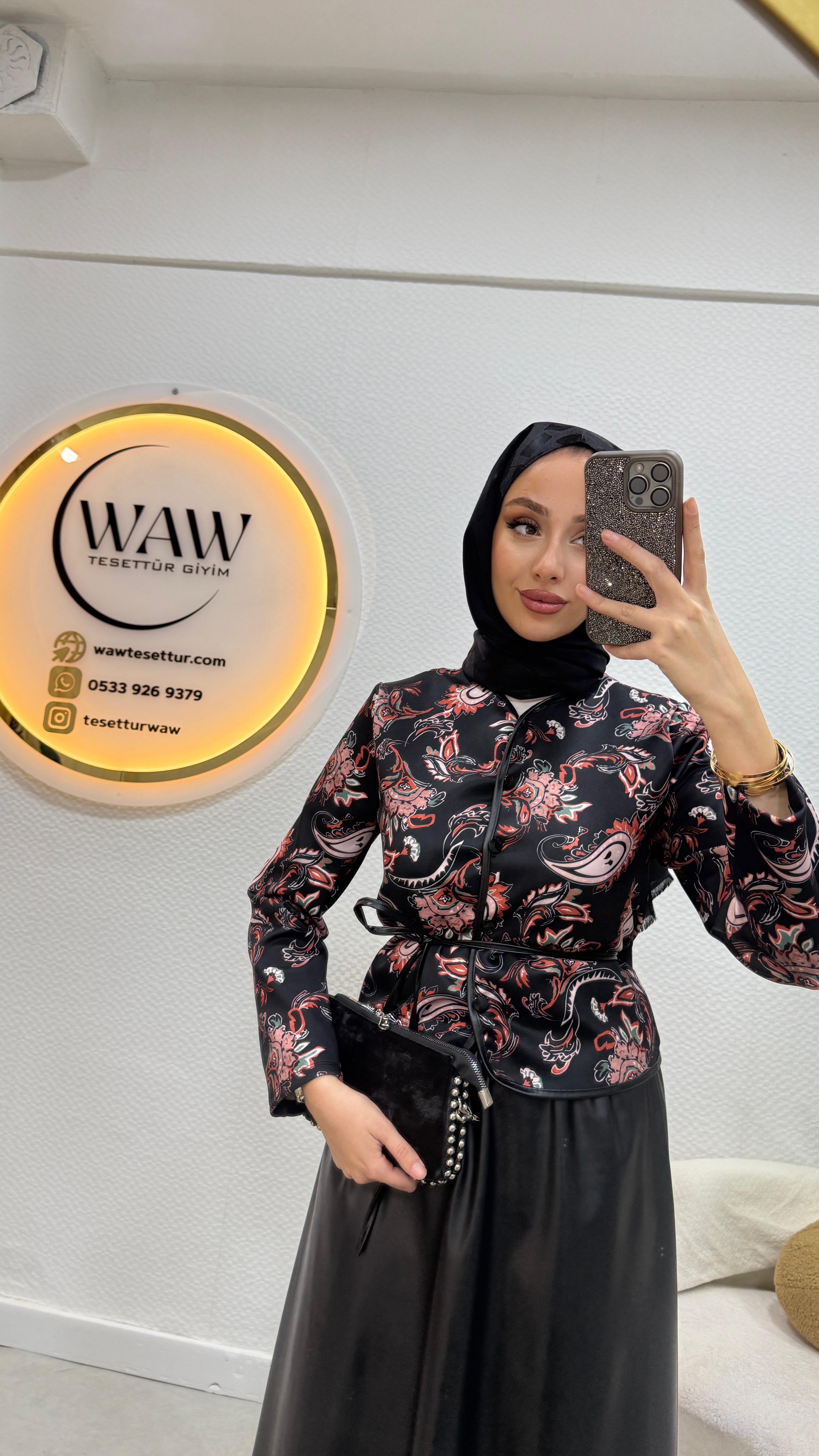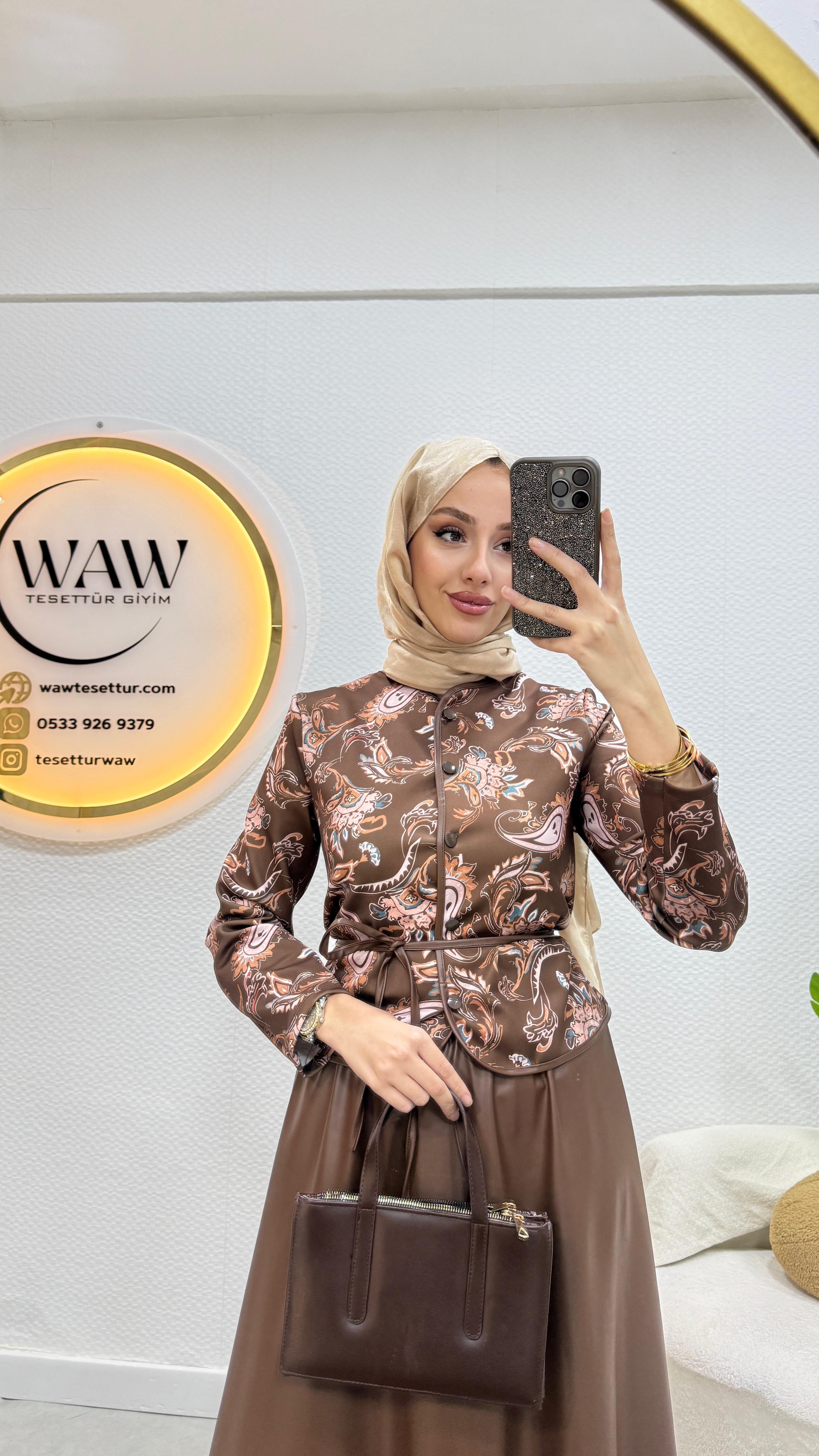Üst kumaş puf desenli, etek deri kumaştan üretilmiştir.Önü düğmelidir Ceket boyu 55 cm, etek boyu 95 cmSeyyar kemerlidir.Manken 170/60kg 38 giymektedir