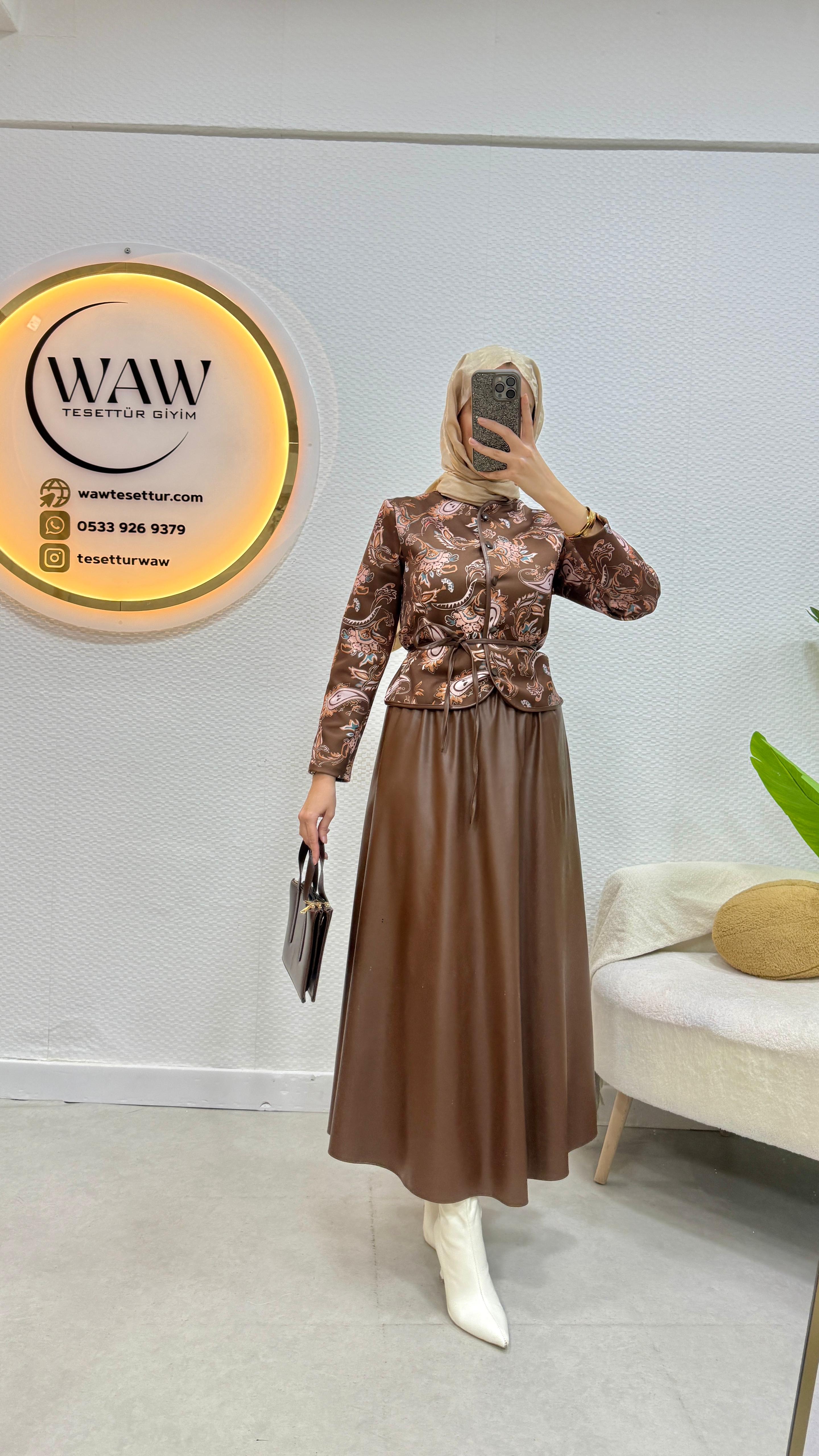 Üst kumaş puf desenli, etek deri kumaştan üretilmiştir.Önü düğmelidir Ceket boyu 55 cm, etek boyu 95 cmSeyyar kemerlidir.Manken 170/60kg 38 giymektedir