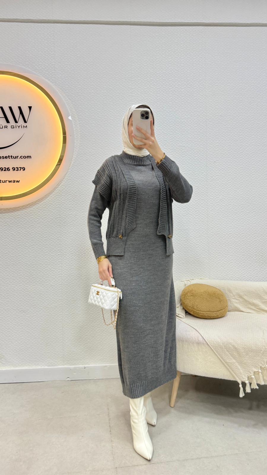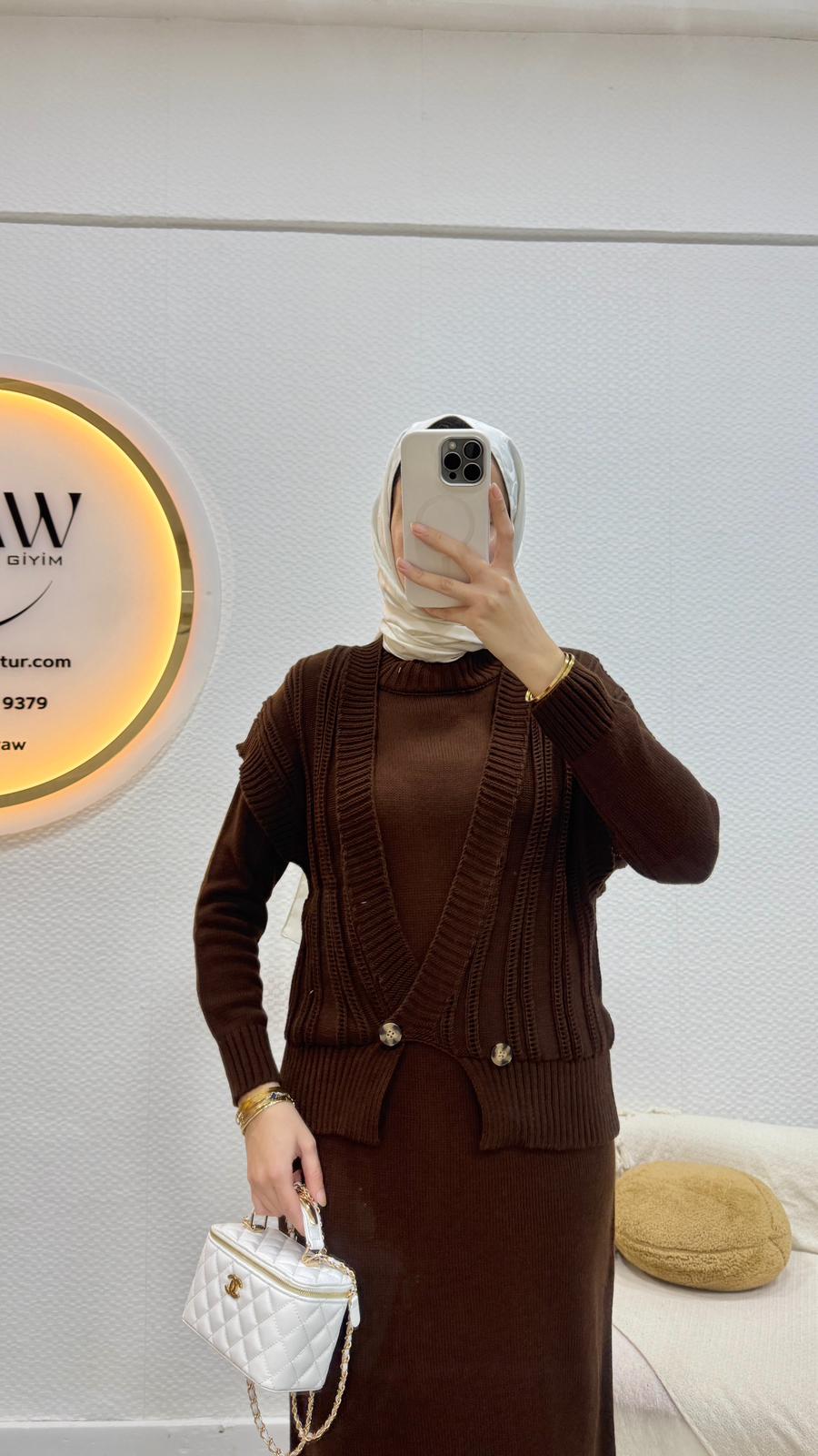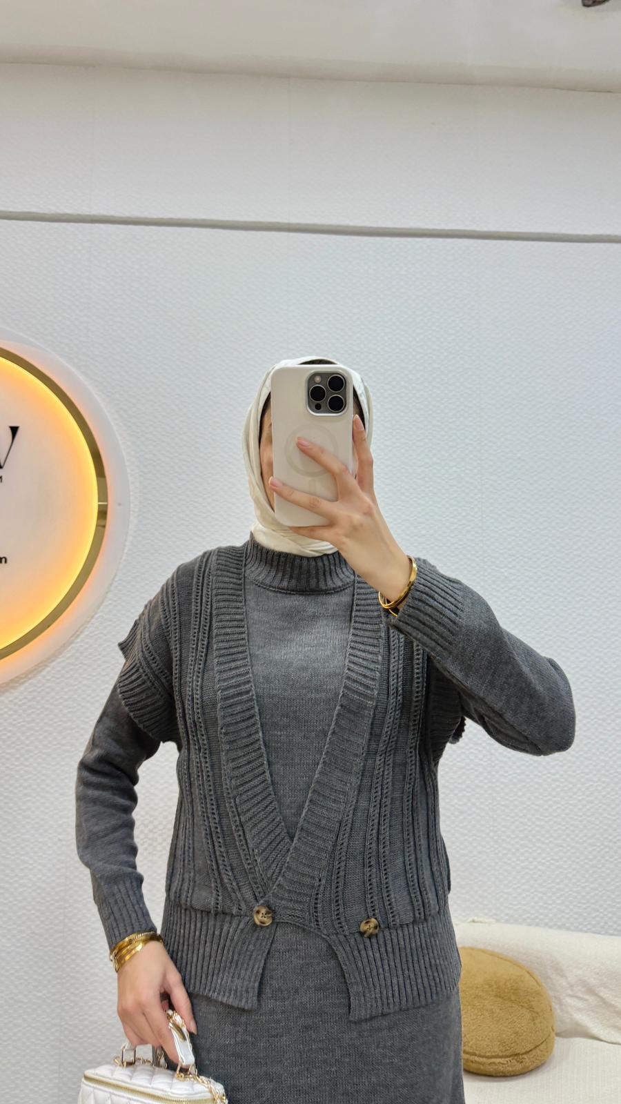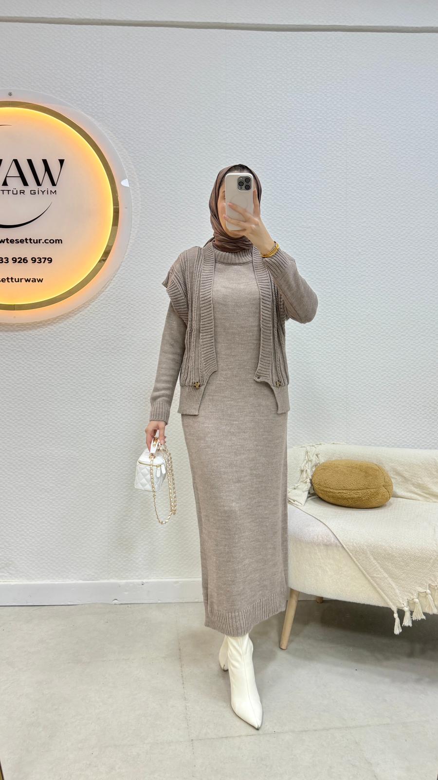 Birinci kalite trikodan üretilmiştir.Elbise/yelek şeklinde ikili takımdır.Yelek düğmelidir.Üst 59cm, alt 127cm'dir.Standart bedendir.(36/44 uyumludur.)Çekim mankeni 170/60kg’dır.