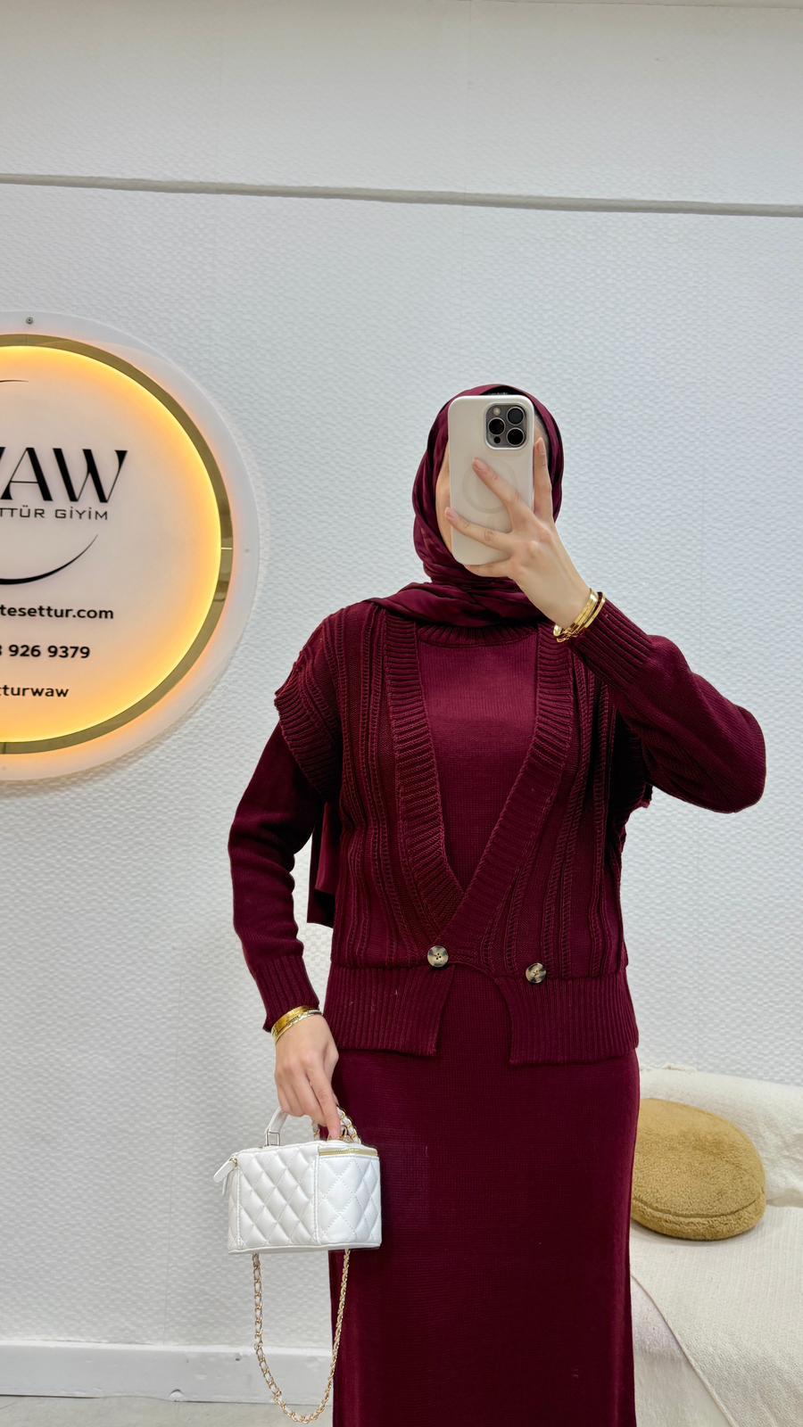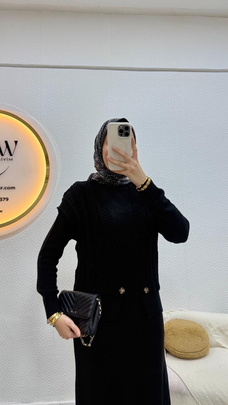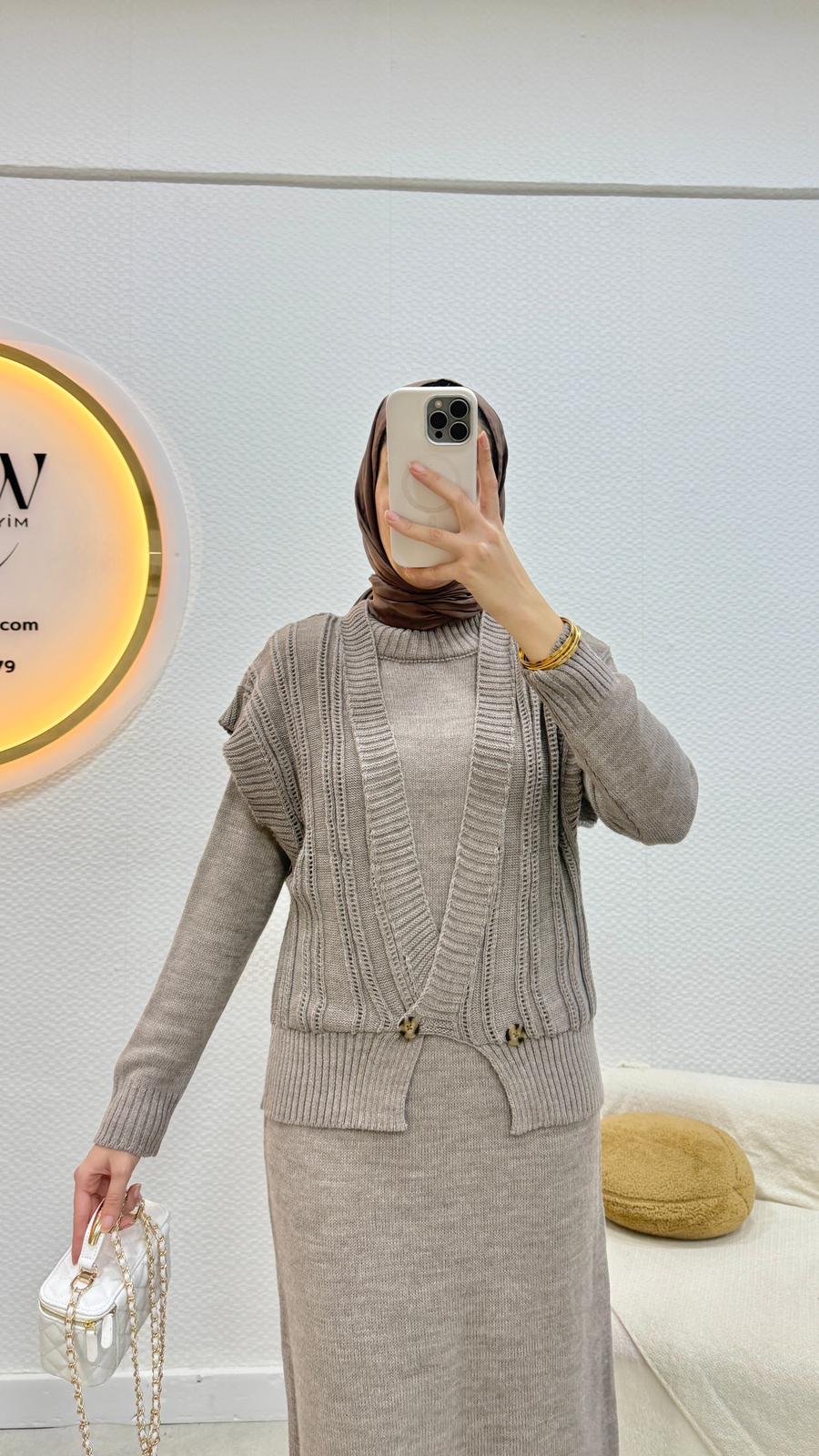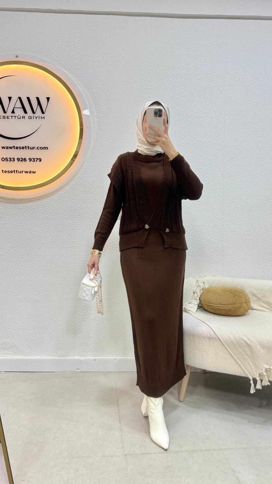 Birinci kalite trikodan üretilmiştir.Elbise/yelek şeklinde ikili takımdır.Yelek düğmelidir.Üst 59cm, alt 127cm'dir.Standart bedendir.(36/44 uyumludur.)Çekim mankeni 170/60kg’dır.