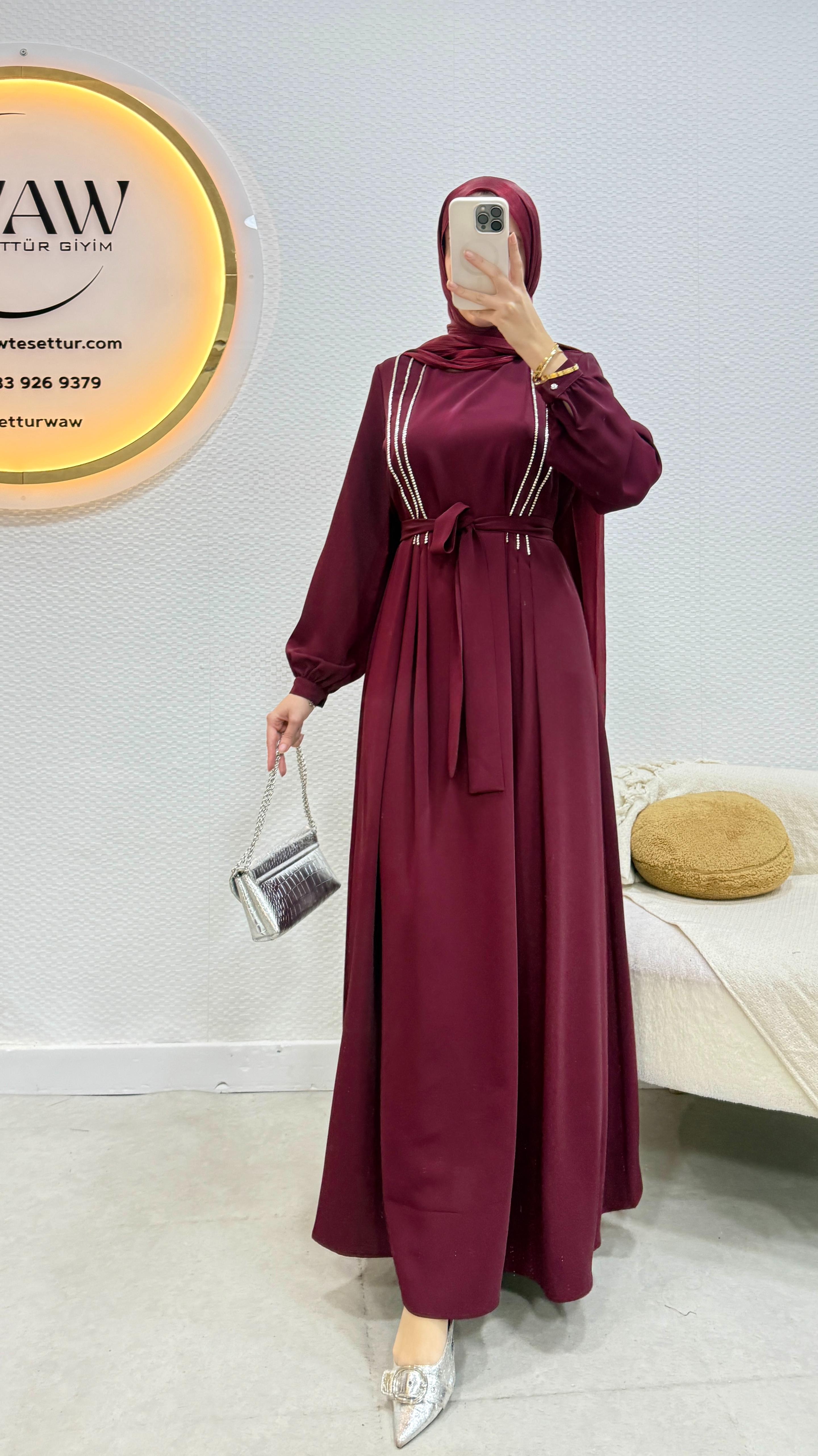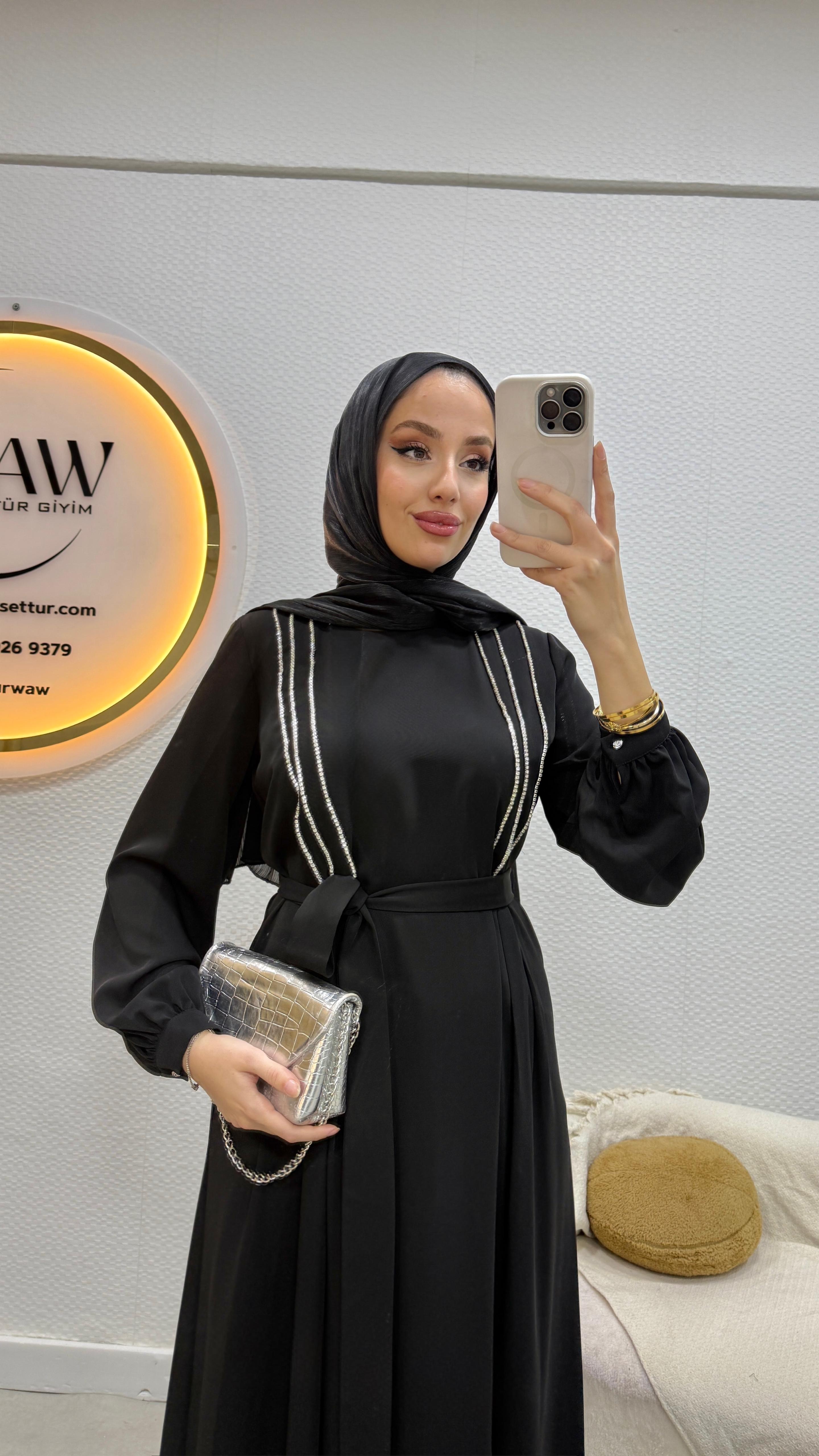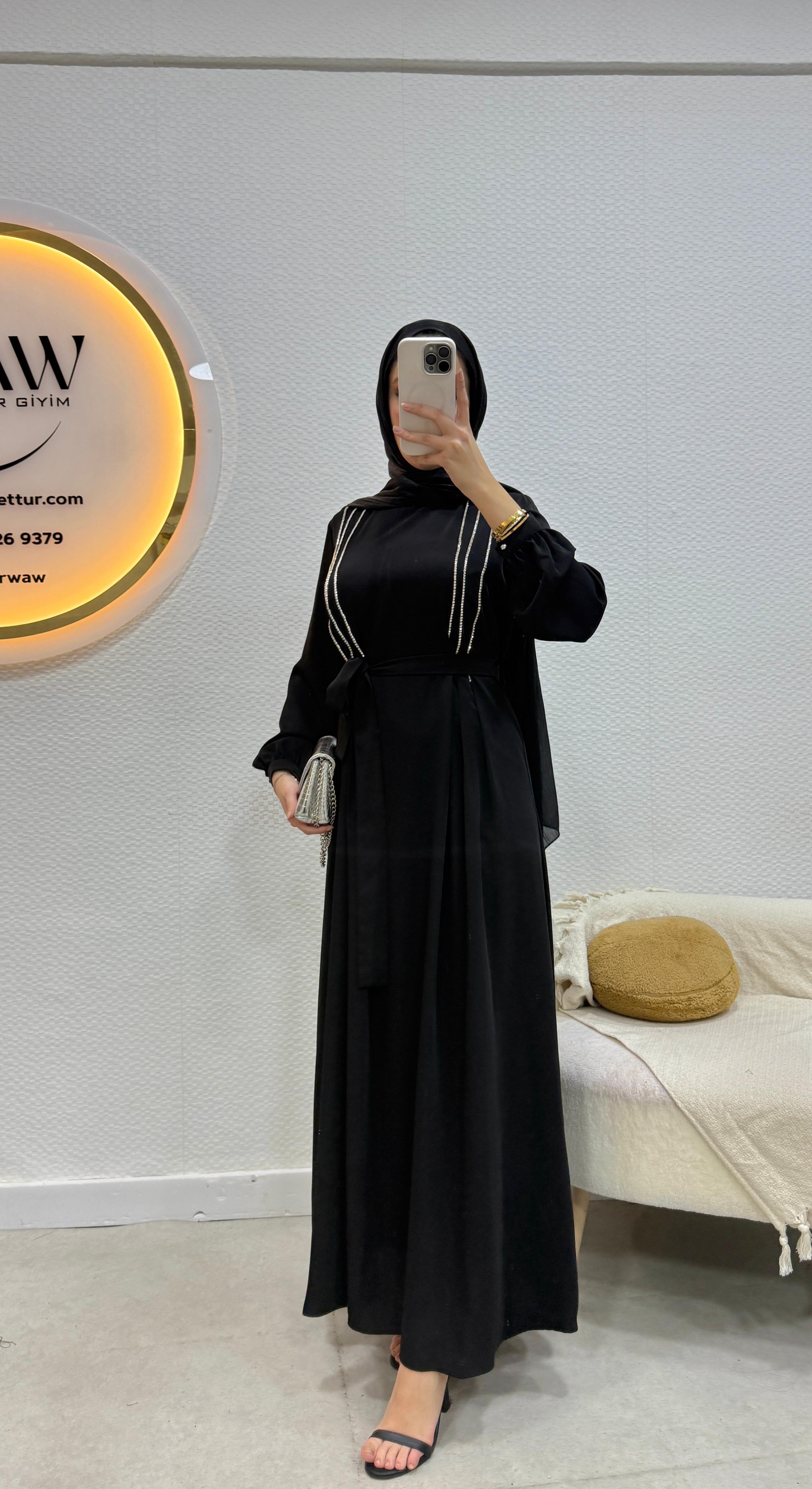 Zen Abaya Ürünümüz birinci kalite ithal krep kumaştan üretilmiştir. Manşet düğme detaylıdır. Seyyar kemerlidir. Ürün boyu 135cm’dir. Pırlanta detaylıdır. 38/40/42/44/46/48 beden mevcuttur. Bisiklet yakadır. Manken 170/60kg 38 giymektedir.
